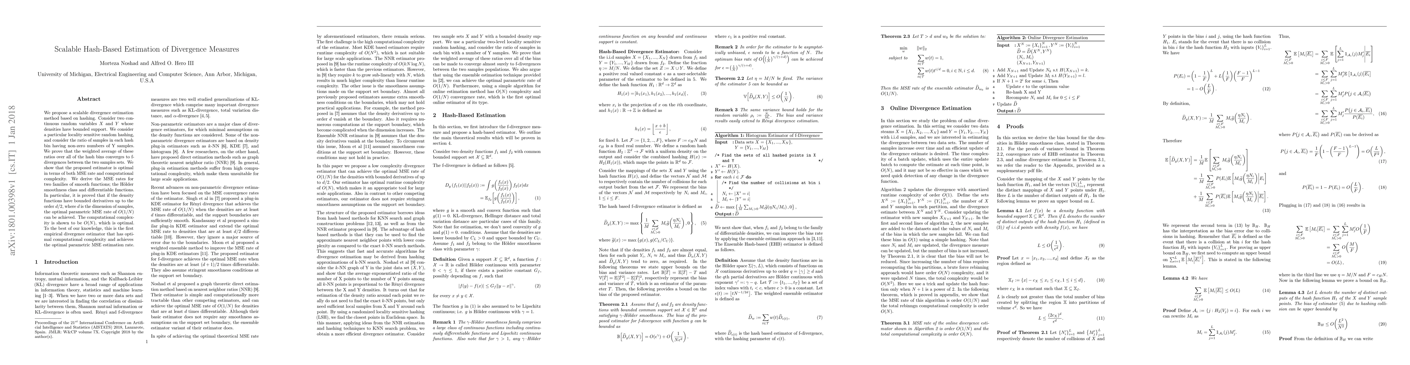 This paper introduces a scalable hashing-based method for estimating f-divergences between two continuous random variable sets, proving its optimality in terms of both mean squared error rate and computational complexity. The method achieves an optimal $O(1/N)$ parametric MSE rate and $O(N)$ computational complexity.