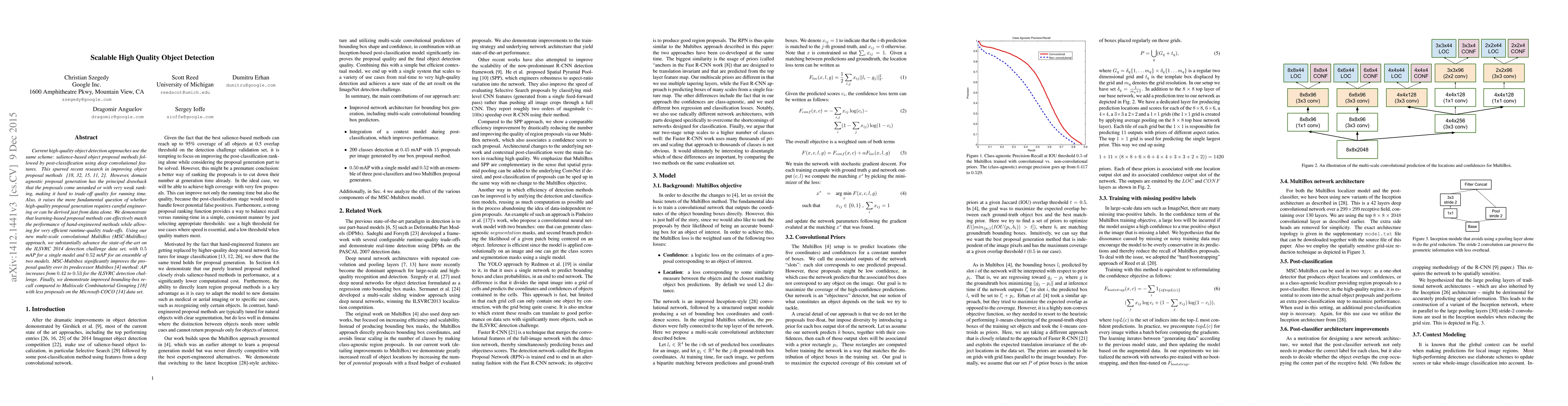 This paper proposes the multi-scale convolutional MultiBox (MSC-MultiBox) approach for scalable, high-quality object detection, achieving state-of-the-art results on the ILSVRC 2014 dataset and significantly improving proposal quality compared to previous methods. It demonstrates efficient runtime-quality trade-offs and better bounding-box recall on the Microsoft-COCO dataset.