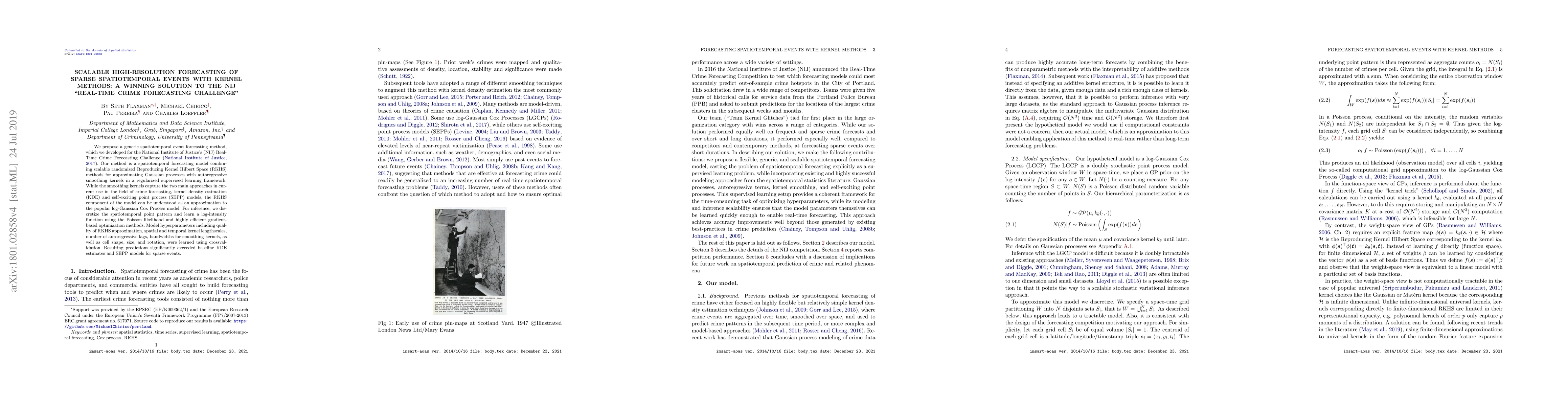 This paper presents a scalable high-resolution spatiotemporal forecasting model for sparse crime events, combining randomized Reproducing Kernel Hilbert Space methods with autoregressive smoothing kernels. The proposed method outperformed baseline models in the NIJ "Real-Time Crime Forecasting Challenge" by leveraging cross-validated hyperparameters and efficient gradient-based optimization.