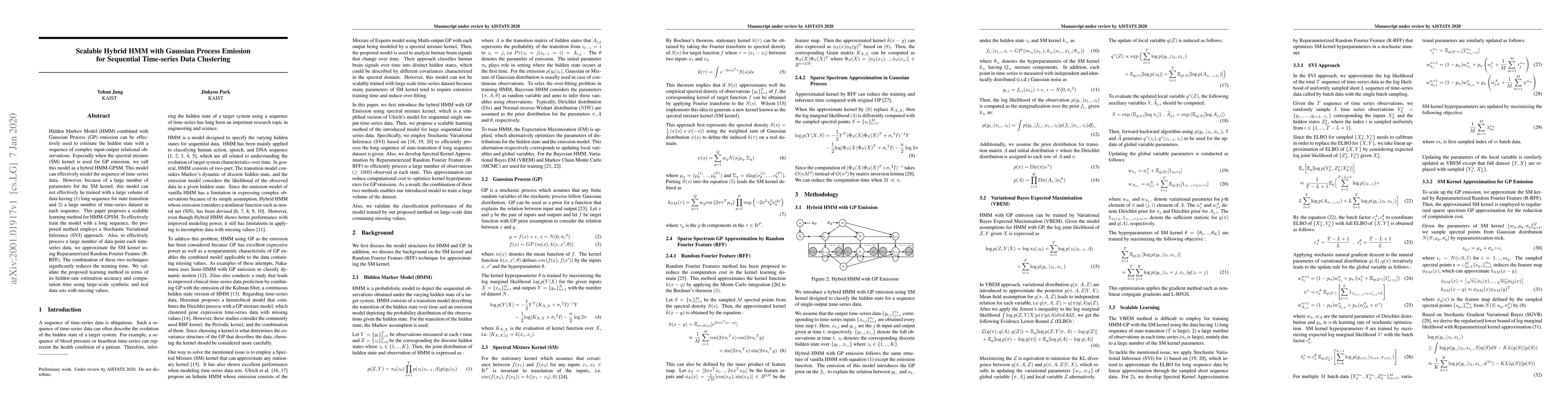 This paper proposes a scalable hybrid HMM with Gaussian Process emission for clustering time-series data, addressing the training challenges of large datasets. It uses Stochastic Variational Inference and Reparametrized Random Fourier Features to efficiently handle long sequences and large datasets, validated by improved accuracy and reduced computation time.