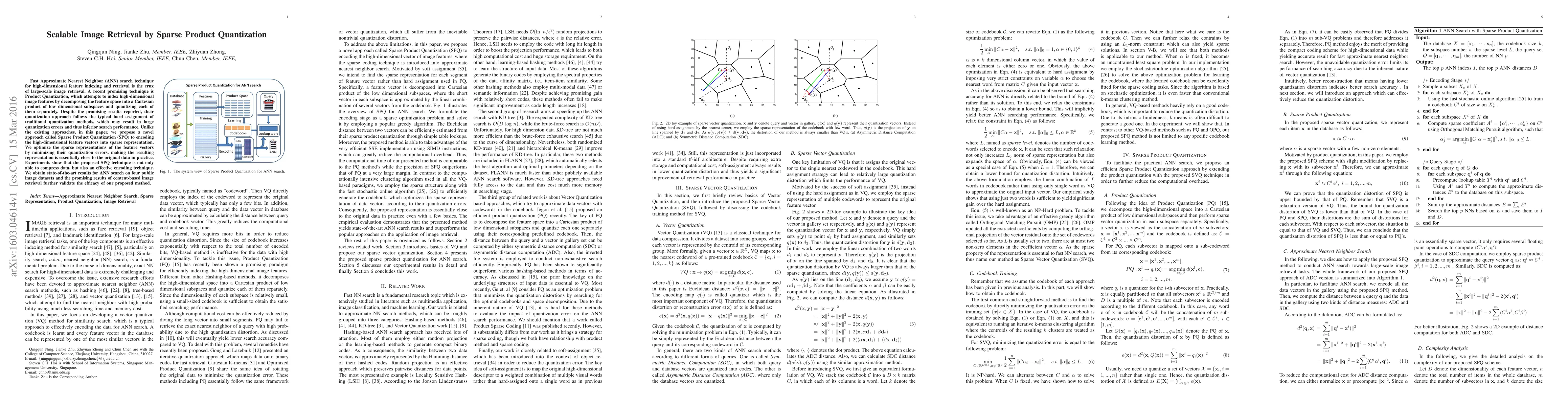 The paper introduces Sparse Product Quantization (SPQ), a new method for efficiently encoding high-dimensional image features with minimal errors, leading to improved large-scale image retrieval. Experiments show that SPQ outperforms existing techniques, achieving state-of-the-art results in approximate nearest neighbor search.