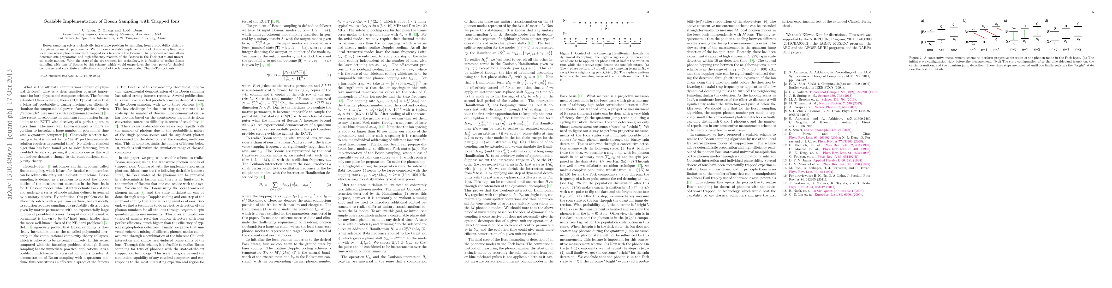 The paper proposes a scalable implementation of Boson sampling using trapped ions, leveraging their local transverse phonon modes to encode Bosons. This method enables deterministic preparation and efficient readout, potentially surpassing classical computers in performance and challenging the extended Church-Turing thesis.