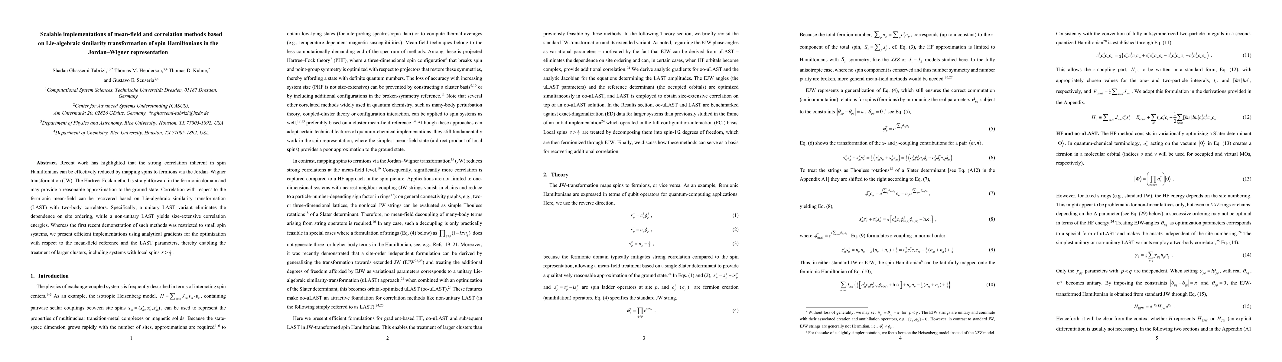 Recent work has highlighted that the strong correlation inherent in spin Hamiltonians can be effectively reduced by mapping spins to fermions via the Jordan-Wigner transformation (JW). The Hartree-Fock method is straightforward in the fermionic domain and may provide a reasonable approximation to the ground state. Correlation with respect to the fermionic mean-field can be recovered based on Lie-algebraic similarity transformation (LAST) with two-body correlators. Specifically, a unitary LAST variant eliminates the dependence on site ordering, while a non-unitary LAST yields size-extensive correlation energies. Whereas the first recent demonstration of such methods was restricted to small spin systems, we present efficient implementations using analytical gradients for the optimization with respect to the mean-field reference and the LAST parameters, thereby enabling the treatment of larger clusters, including systems with local spins s > 1/2.