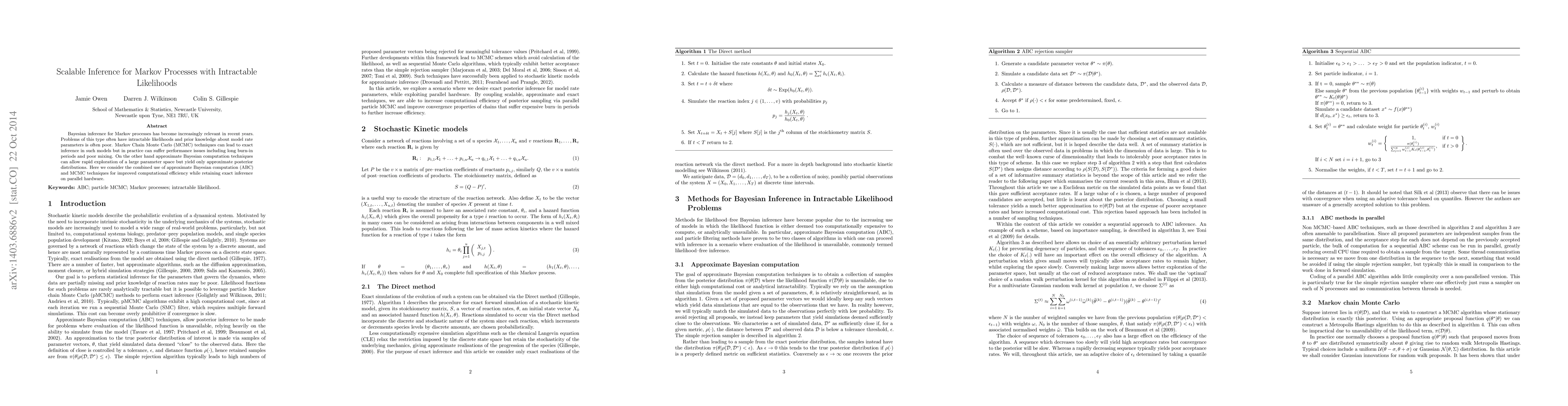 This paper proposes an approach combining Approximate Bayesian Computation (ABC) and Markov Chain Monte Carlo (MCMC) techniques to efficiently infer parameters in Markov processes with intractable likelihoods, aiming to balance computational speed and accuracy on parallel hardware. The method seeks to mitigate the performance issues of traditional MCMC while providing more precise posterior distributions than pure ABC methods.