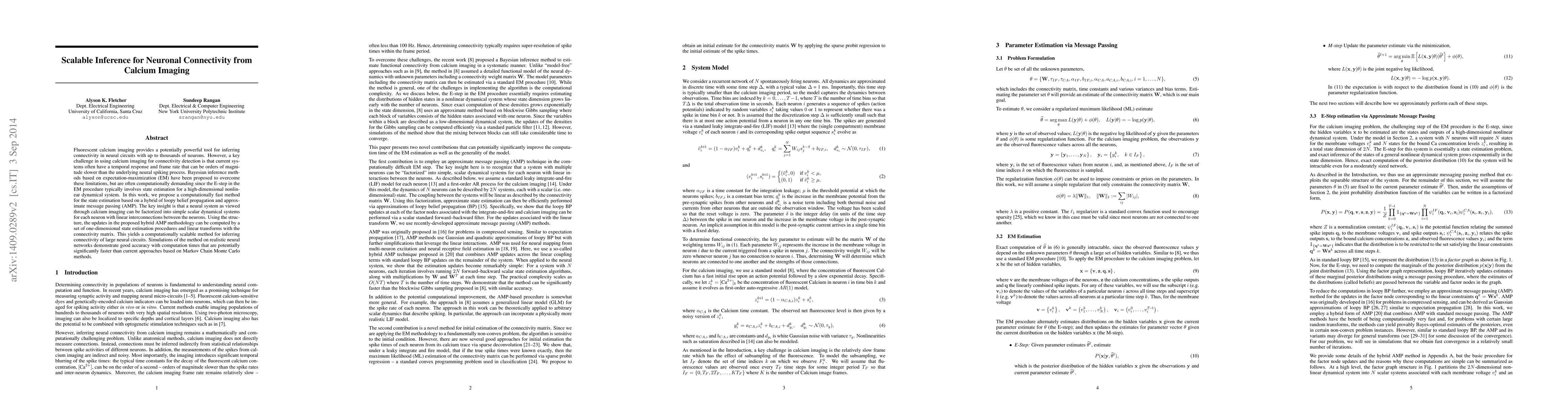 This paper proposes a fast, scalable method for inferring neuronal connectivity from calcium imaging data using a hybrid of loopy belief propagation and approximate message passing (AMP). The method decomposes the neural system into simpler scalar dynamical systems, allowing for efficient computation and demonstrating good accuracy with significantly reduced computation times compared to existing Markov Chain Monte Carlo methods.
