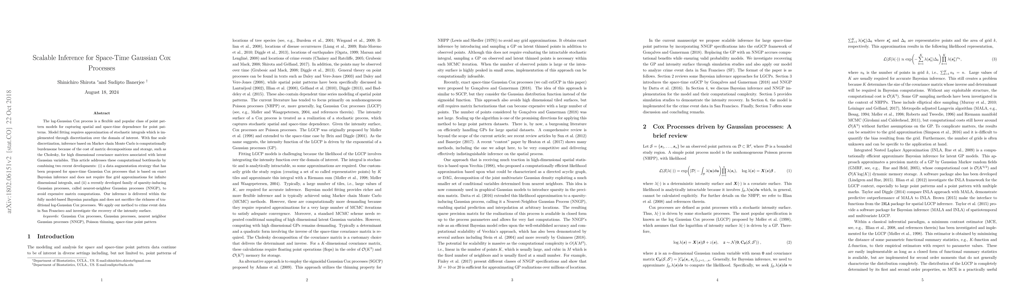 This paper proposes a scalable inference method for log-Gaussian Cox processes by combining data augmentation and nearest-neighbor Gaussian processes to avoid high-dimensional matrix computations, enabling efficient Bayesian inference for space-time point pattern models. The method is demonstrated on crime event data in San Francisco to recover the intensity surface.