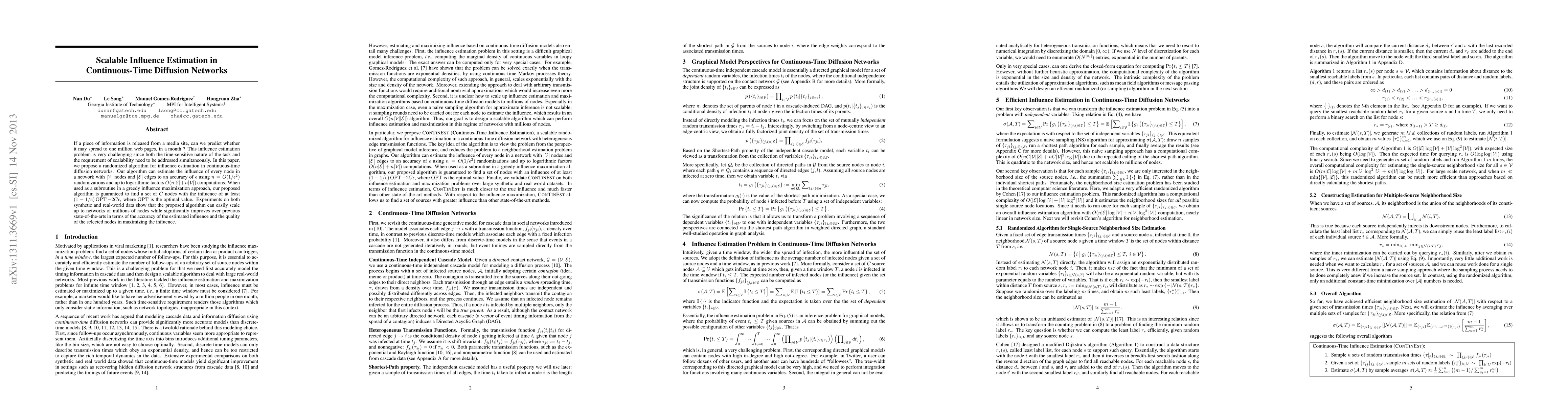 This paper proposes a scalable randomized algorithm for estimating influence in continuous-time diffusion networks, achieving accuracy with $\varepsilon$ using $O(1/\varepsilon^2)$ randomizations. The method scales to networks of millions of nodes and outperforms previous methods in accuracy and influence maximization.