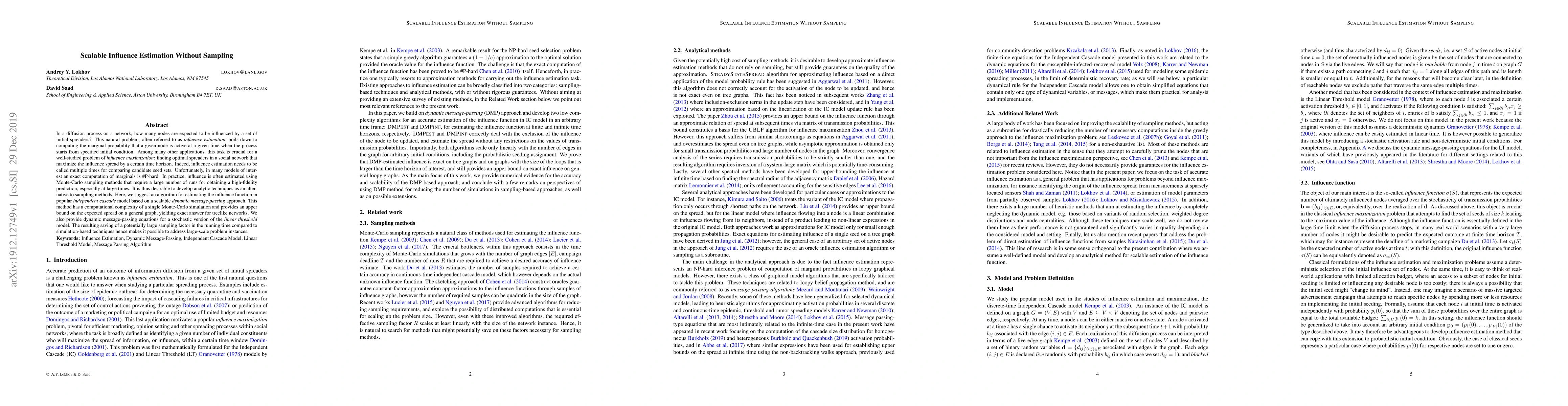 In a diffusion process on a network, how many nodes are expected to be influenced by a set of initial spreaders? This natural problem, often referred to as influence estimation, boils down to computing the marginal probability that a given node is active at a given time when the process starts from specified initial condition. Among many other applications, this task is crucial for a well-studied problem of influence maximization: finding optimal spreaders in a social network that maximize the influence spread by a certain time horizon. Indeed, influence estimation needs to be called multiple times for comparing candidate seed sets. Unfortunately, in many models of interest an exact computation of marginals is #P-hard. In practice, influence is often estimated using Monte-Carlo sampling methods that require a large number of runs for obtaining a high-fidelity prediction, especially at large times. It is thus desirable to develop analytic techniques as an alternative to sampling methods. Here, we suggest an algorithm for estimating the influence function in popular independent cascade model based on a scalable dynamic message-passing approach. This method has a computational complexity of a single Monte-Carlo simulation and provides an upper bound on the expected spread on a general graph, yielding exact answer for treelike networks. We also provide dynamic message-passing equations for a stochastic version of the linear threshold model. The resulting saving of a potentially large sampling factor in the running time compared to simulation-based techniques hence makes it possible to address large-scale problem instances.