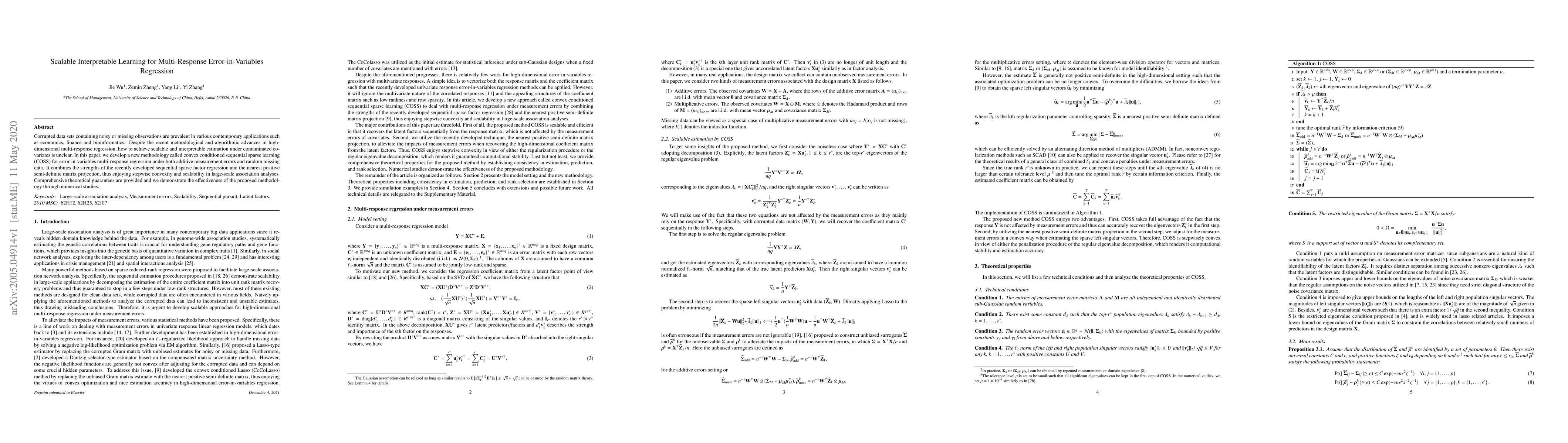 This paper introduces COSS, a scalable and interpretable methodology for error-in-variables multi-response regression, addressing measurement errors and missing data. It combines sequential sparse factor regression and nearest positive semi-definite matrix projection, offering theoretical guarantees and demonstrating effectiveness through numerical studies.