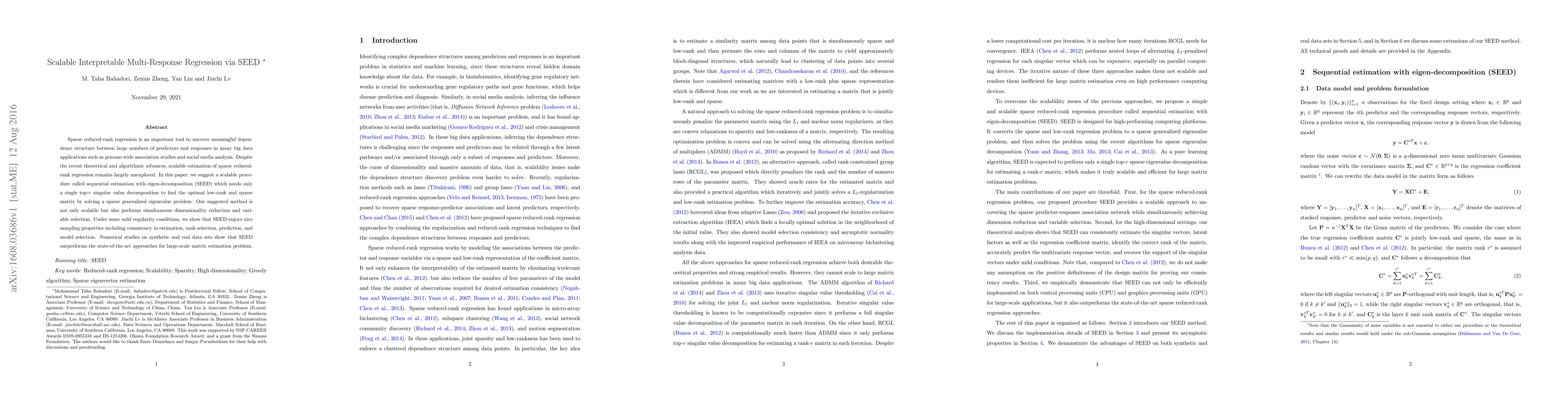 This paper proposes a scalable method called SEED for sparse reduced-rank regression, which efficiently estimates optimal low-rank and sparse matrices through a single singular value decomposition. The method demonstrates strong performance in both dimensionality reduction and variable selection, outperforming existing approaches in large-scale data applications.