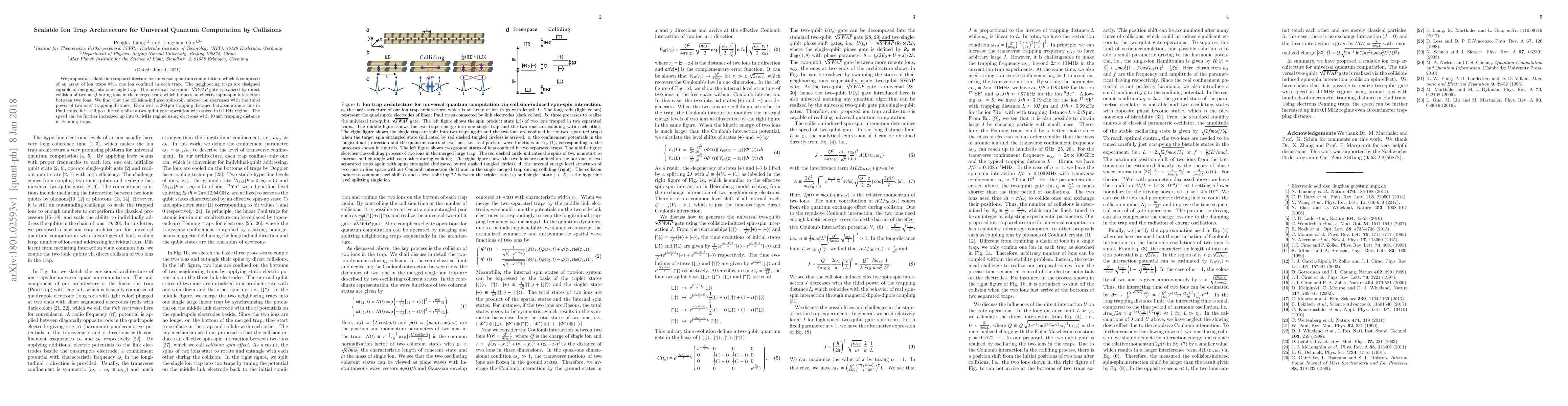 This paper proposes a scalable ion trap architecture for universal quantum computation, utilizing collisions between neighboring ions in merged traps to achieve a universal two-qubit gate. The collision-induced spin-spin interaction is shown to be feasible even at a trapping distance of $200\ \mu m$, with gate operation speeds up to $0.1\ kHz$, and potentially higher with electrons.
