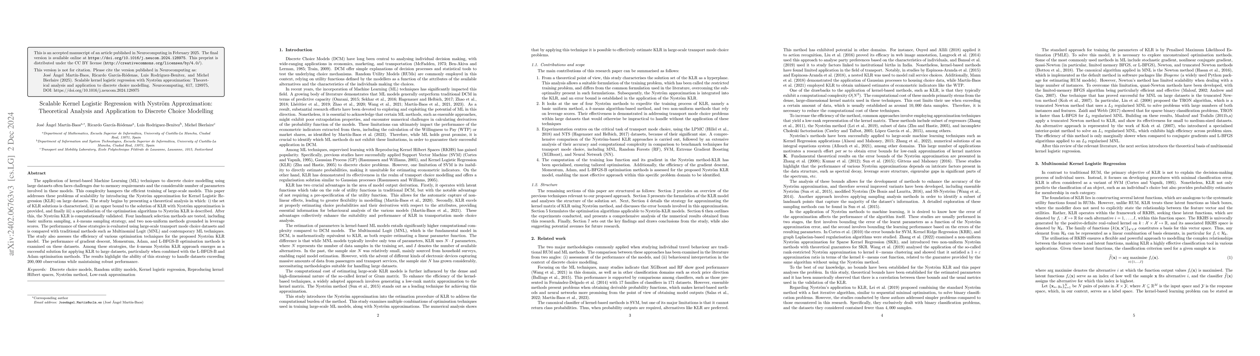 This paper introduces the Nyström approximation for scalable Kernel Logistic Regression (KLR) to address memory and parameter challenges in large-scale discrete choice modelling. It presents a theoretical analysis and computational validation, comparing various landmark selection methods and optimisation techniques, ultimately finding the k-means Nyström KLR approach with L-BFGS-B and Adam optimisation methods to be effective for datasets exceeding 200,000 observations.