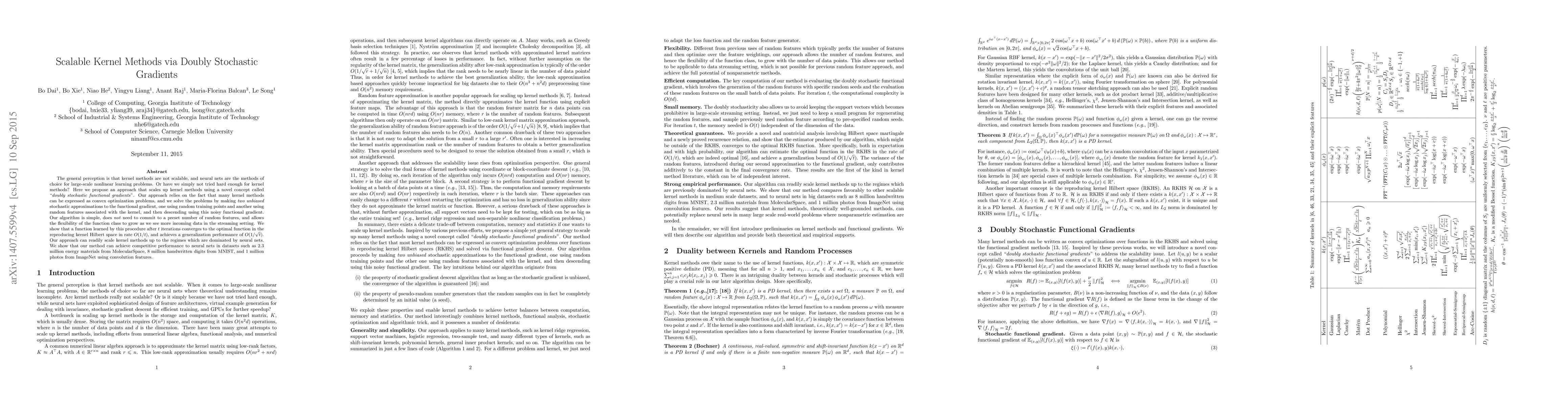 This paper proposes a scalable approach to kernel methods using "doubly stochastic functional gradients," which leverages two stochastic approximations to solve convex optimization problems. The method achieves competitive performance to neural networks on large datasets while maintaining a small memory footprint.