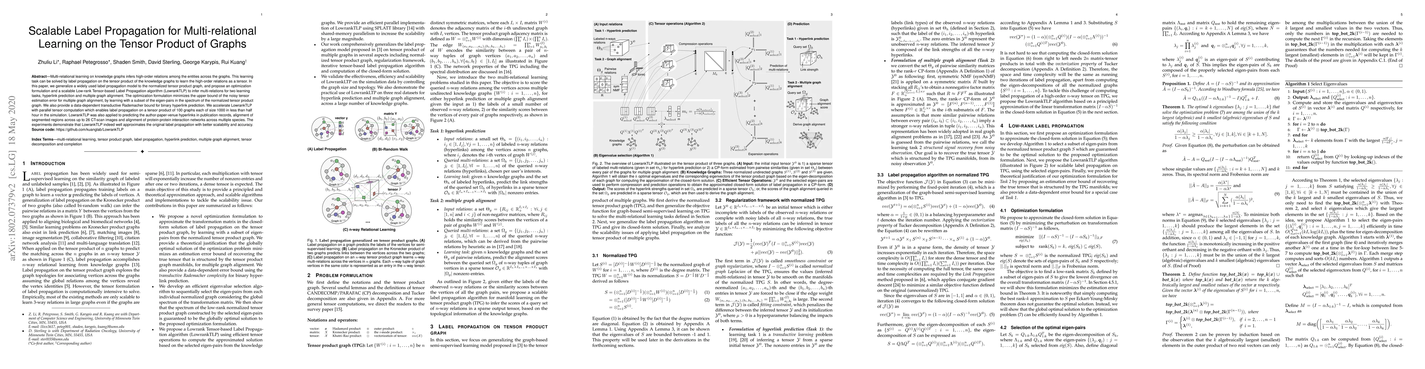 Multi-relational learning on knowledge graphs infers high-order relations among the entities across the graphs. This learning task can be solved by label propagation on the tensor product of the knowledge graphs to learn the high-order relations as a tensor. In this paper, we generalize a widely used label propagation model to the normalized tensor product graph, and propose an optimization formulation and a scalable Low-rank Tensor-based Label Propagation algorithm (LowrankTLP) to infer multi-relations for two learning tasks, hyperlink prediction and multiple graph alignment. The optimization formulation minimizes the upper bound of the noisy tensor estimation error for multiple graph alignment, by learning with a subset of the eigen-pairs in the spectrum of the normalized tensor product graph. We also provide a data-dependent transductive Rademacher bound for binary hyperlink prediction. We accelerate LowrankTLP with parallel tensor computation which enables label propagation on a tensor product of 100 graphs each of size 1000 in less than half hour in the simulation. LowrankTLP was also applied to predicting the author-paper-venue hyperlinks in publication records, alignment of segmented regions across up to 26 CT-scan images and alignment of protein-protein interaction networks across multiple species. The experiments demonstrate that LowrankTLP indeed well approximates the original label propagation with better scalability and accuracy.