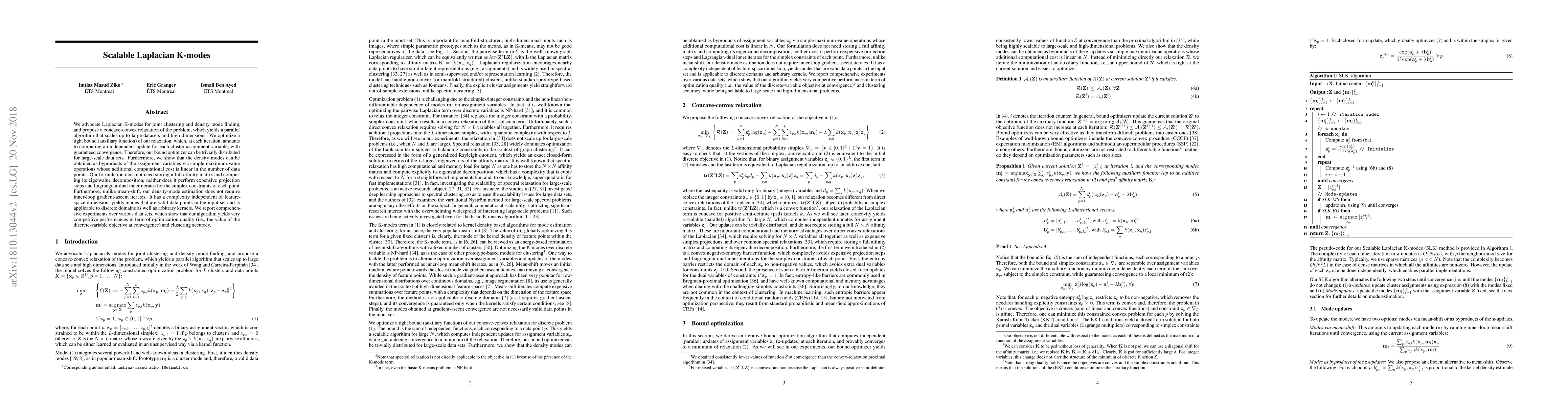 We advocate Laplacian K-modes for joint clustering and density mode finding, and propose a concave-convex relaxation of the problem, which yields a parallel algorithm that scales up to large datasets and high dimensions. We optimize a tight bound (auxiliary function) of our relaxation, which, at each iteration, amounts to computing an independent update for each cluster-assignment variable, with guaranteed convergence. Therefore, our bound optimizer can be trivially distributed for large-scale data sets. Furthermore, we show that the density modes can be obtained as byproducts of the assignment variables via simple maximum-value operations whose additional computational cost is linear in the number of data points. Our formulation does not need storing a full affinity matrix and computing its eigenvalue decomposition, neither does it perform expensive projection steps and Lagrangian-dual inner iterates for the simplex constraints of each point. Furthermore, unlike mean-shift, our density-mode estimation does not require inner-loop gradient-ascent iterates. It has a complexity independent of feature-space dimension, yields modes that are valid data points in the input set and is applicable to discrete domains as well as arbitrary kernels. We report comprehensive experiments over various data sets, which show that our algorithm yields very competitive performances in term of optimization quality (i.e., the value of the discrete-variable objective at convergence) and clustering accuracy.