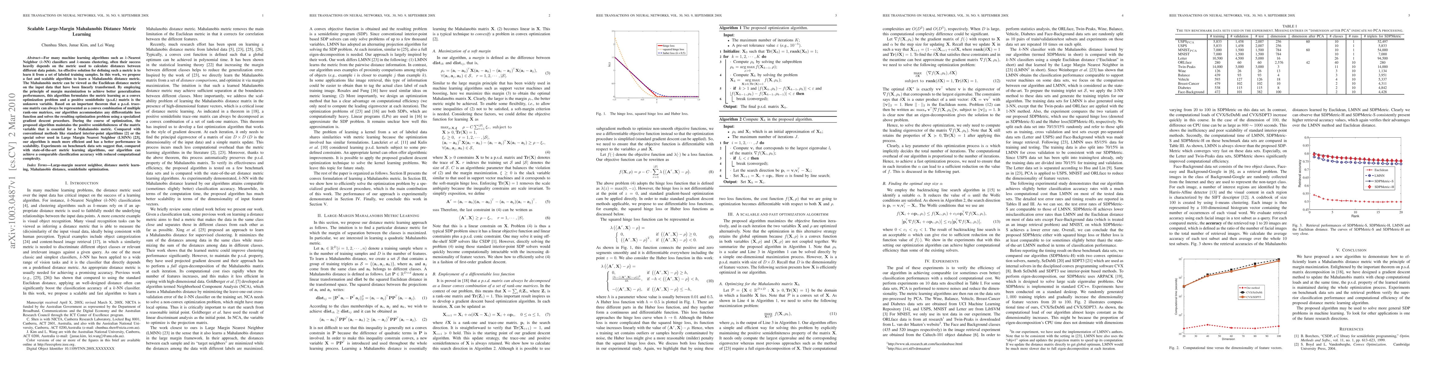 This paper proposes a scalable algorithm for learning a Mahalanobis distance metric through convex optimization, employing margin maximization for better generalization. The method is efficient and outperforms existing techniques in terms of computational complexity and scalability, achieving comparable classification accuracy on benchmark datasets.