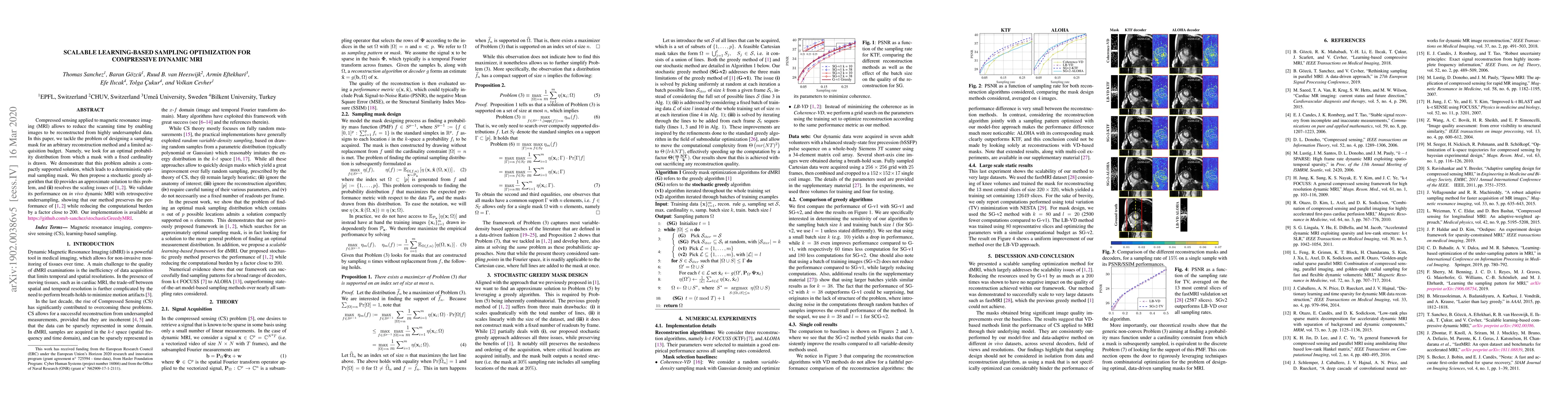 Compressed sensing applied to magnetic resonance imaging (MRI) allows to reduce the scanning time by enabling images to be reconstructed from highly undersampled data. In this paper, we tackle the problem of designing a sampling mask for an arbitrary reconstruction method and a limited acquisition budget. Namely, we look for an optimal probability distribution from which a mask with a fixed cardinality is drawn. We demonstrate that this problem admits a compactly supported solution, which leads to a deterministic optimal sampling mask. We then propose a stochastic greedy algorithm that (i) provides an approximate solution to this problem, and (ii) resolves the scaling issues of [1,2]. We validate its performance on in vivo dynamic MRI with retrospective undersampling, showing that our method preserves the performance of [1,2] while reducing the computational burden by a factor close to 200.