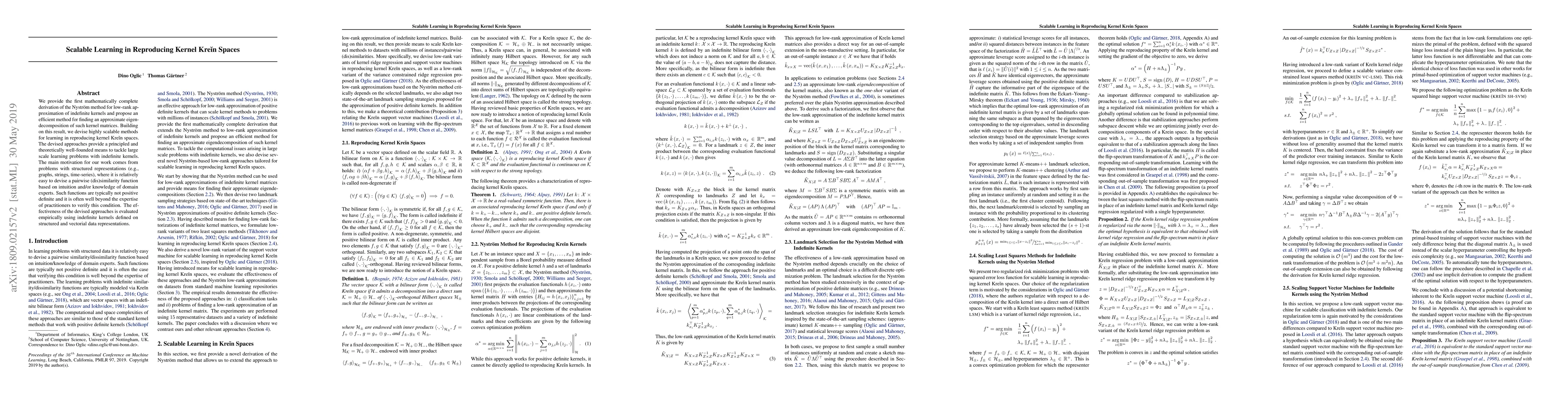 This paper presents a mathematically rigorous derivation of the Nyström method for low-rank approximation of indefinite kernels and proposes scalable methods for learning in reproducing kernel Krein spaces. The developed approaches offer a principled solution for handling large-scale learning problems with non-positive definite kernels, particularly useful for structured data representations.