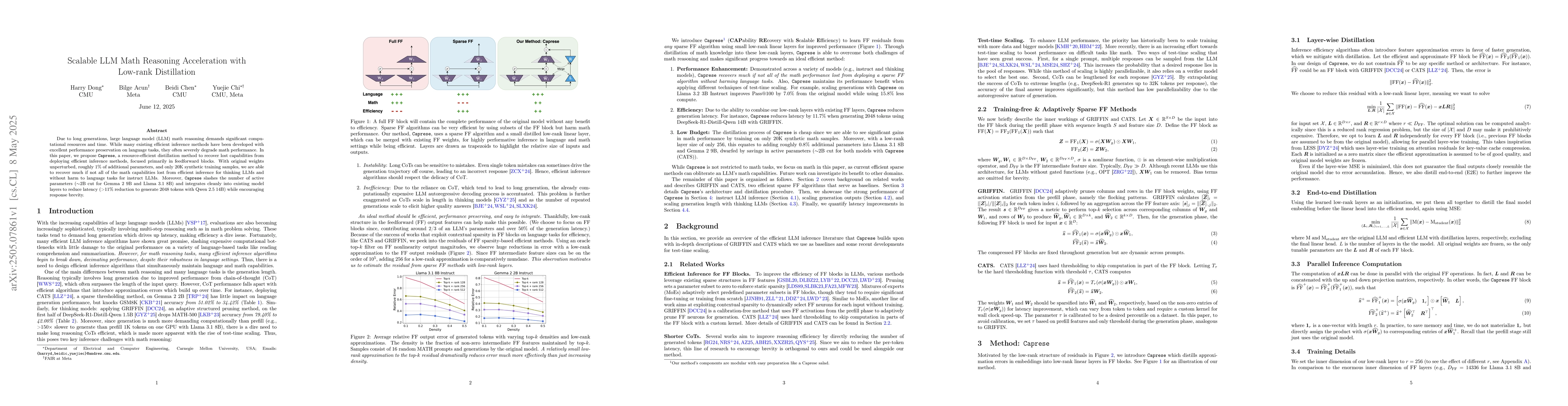 The paper proposes Caprese, a distillation method that recovers math reasoning capabilities lost during efficient inference in LLMs, using only 1% additional parameters and 20K synthetic training samples.