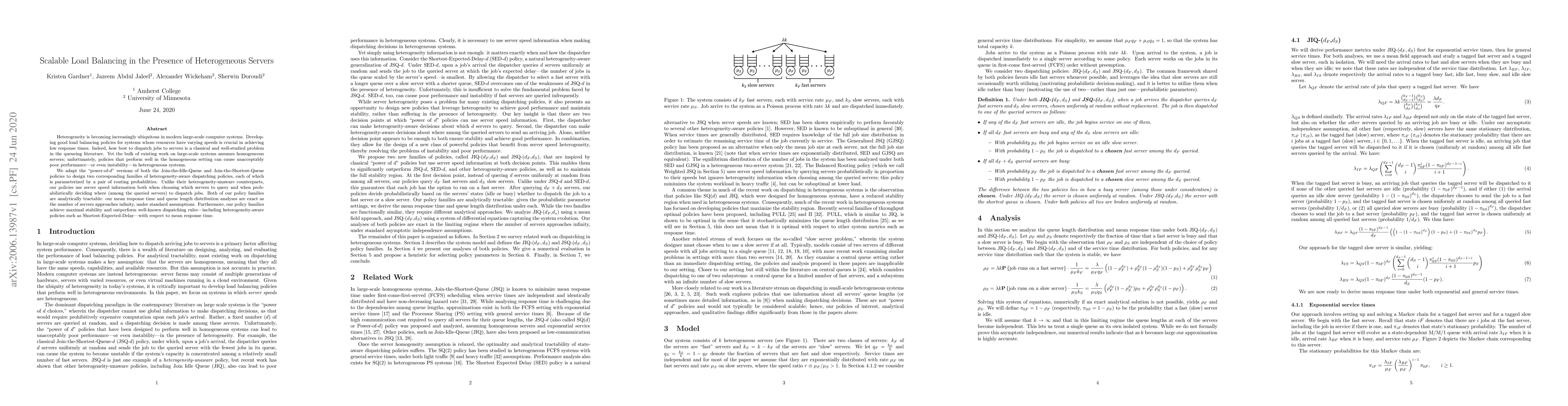 This paper proposes scalable load balancing policies for heterogeneous servers, adapting "power-of-d" versions of Join-the-Idle-Queue and Join-the-Shortest-Queue to account for server speed variations. The new policies achieve maximal stability and outperform existing rules in terms of mean response time.