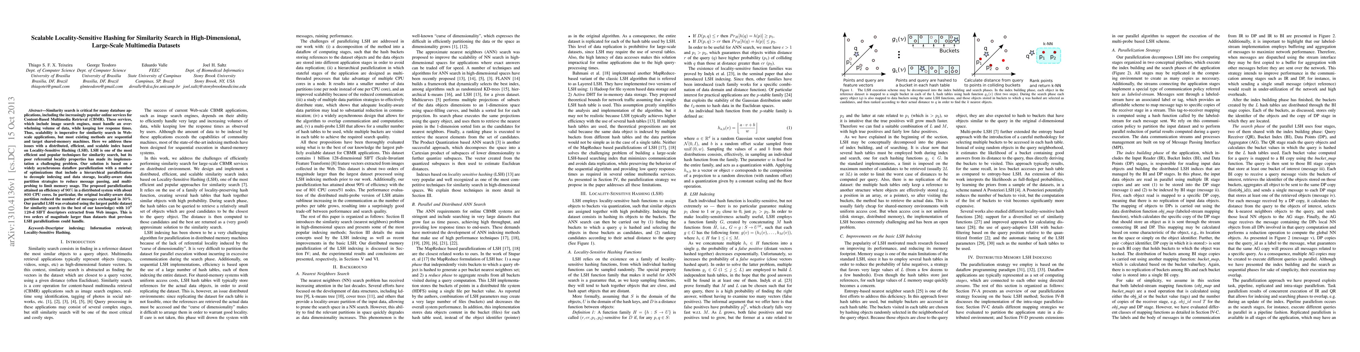 This paper proposes a scalable, distributed Locality-Sensitive Hashing (LSH) method for efficient similarity search in large-scale multimedia datasets. The solution includes asynchronous dataflow parallelization, hierarchical parallelization, and locality-aware data partitioning, achieving 90% efficiency with 800 CPU cores and handling datasets two orders of magnitude larger than previous LSH implementations.