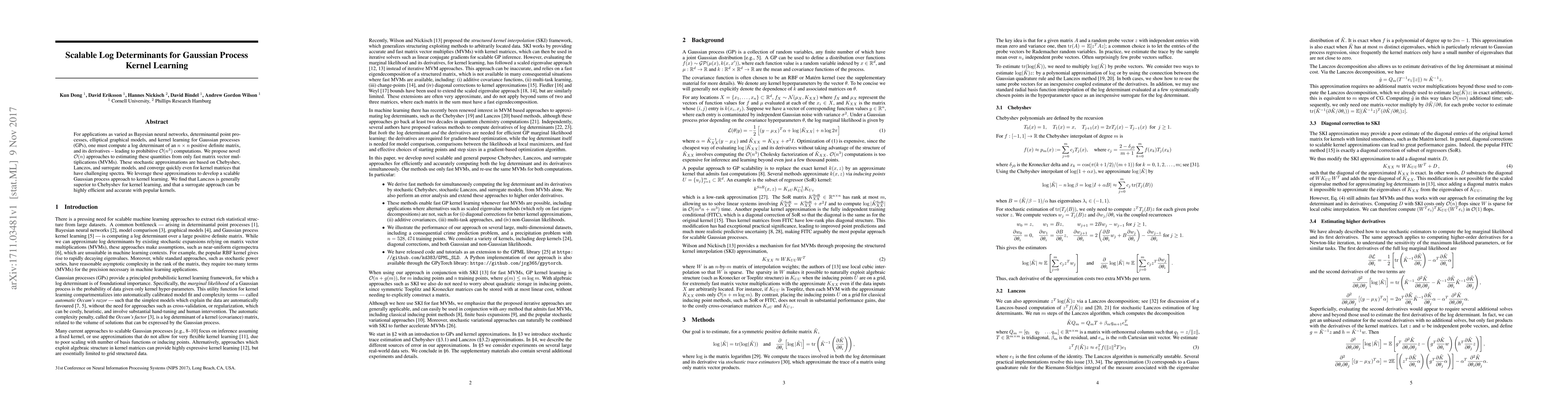 This paper proposes scalable $\mathcal{O}(n)$ methods for estimating the log determinant of large positive definite matrices, using stochastic approximations based on Chebyshev, Lanczos, and surrogate models. The authors demonstrate these methods' efficiency and accuracy in kernel learning for Gaussian processes, finding that Lanczos and surrogate approaches are particularly effective.