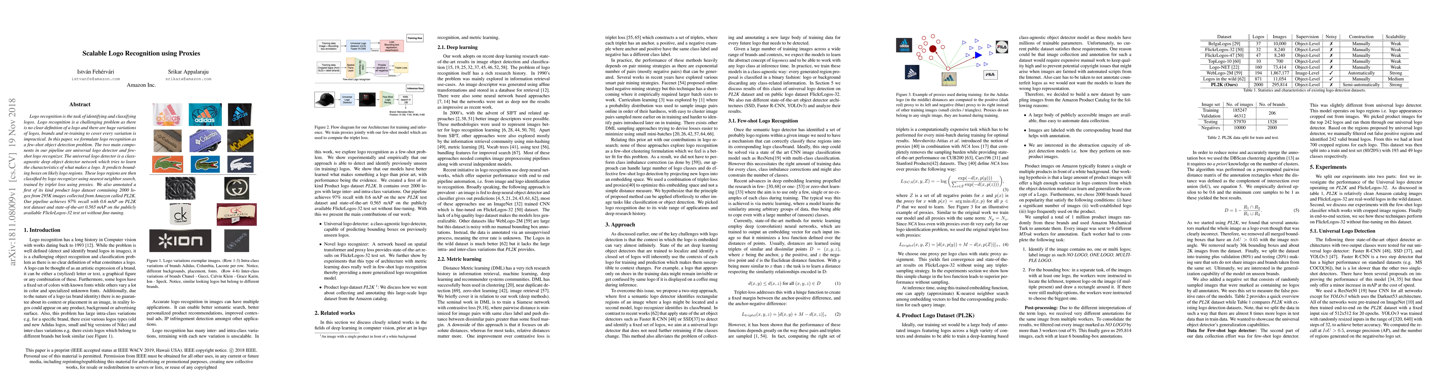 This paper proposes a scalable logo recognition system using a few-shot object detection approach, featuring a universal logo detector and a few-shot logo recognizer trained with proxies. The method achieves high recall and mAP on both a newly created product logo dataset and a public benchmark, demonstrating its effectiveness.