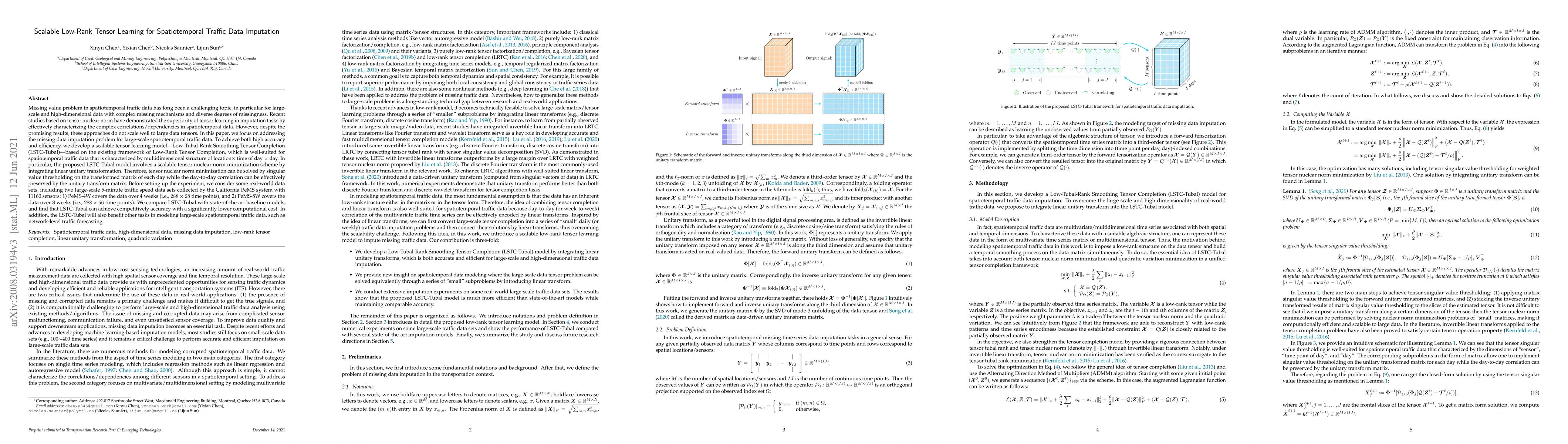 This paper proposes a scalable tensor learning model, LSTC-Tubal, for imputing missing values in large-scale spatiotemporal traffic data. It introduces a tensor nuclear norm minimization scheme with linear unitary transformation to efficiently handle large tensors while preserving day-to-day correlations, achieving competitive accuracy with lower computational costs compared to state-of-the-art baselines.