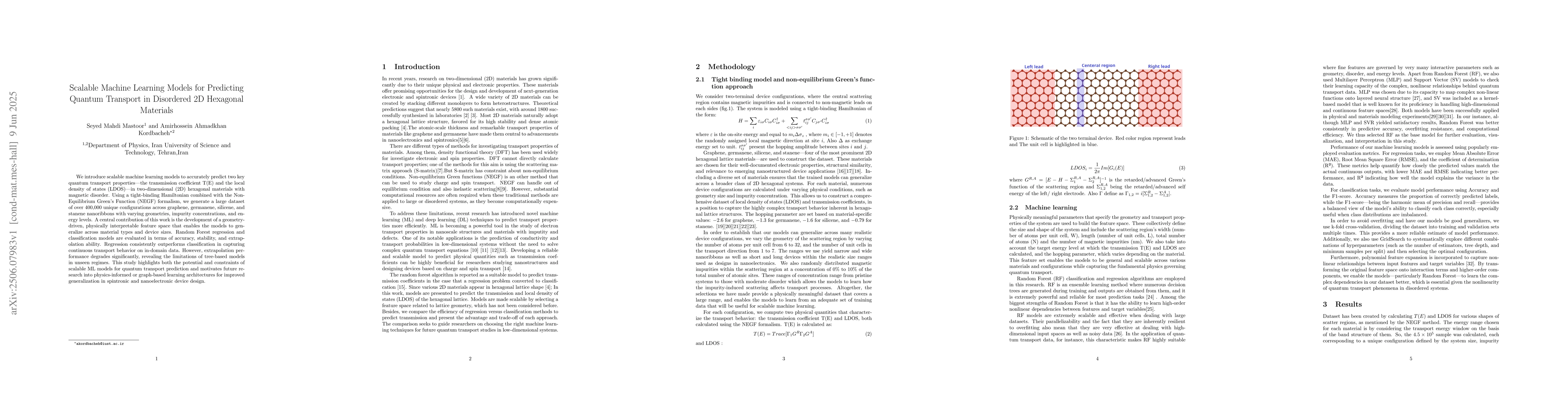 Researchers developed machine learning models to predict quantum transport properties in 2D hexagonal materials with magnetic disorder, showing promise for spintronic device design but highlighting limitations.
