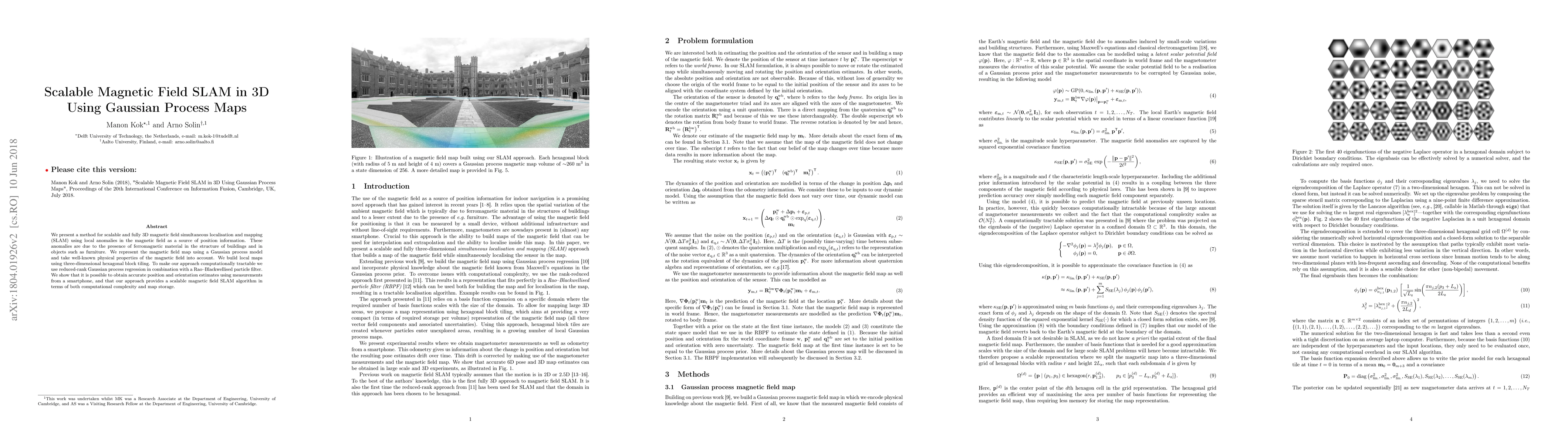 This paper proposes a scalable 3D magnetic field SLAM method using Gaussian process maps to represent local magnetic anomalies caused by ferromagnetic materials. It employs reduced-rank Gaussian process regression and a Rao-Blackwellised particle filter to achieve computational efficiency, demonstrating accurate position and orientation estimates from smartphone measurements.
