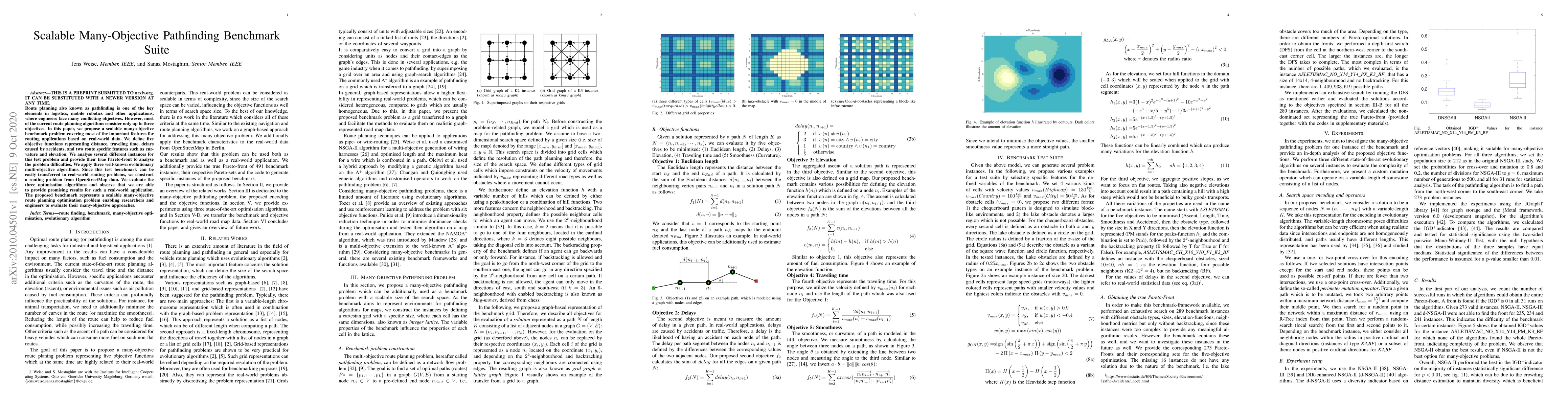 The paper presents a scalable many-objective pathfinding benchmark suite with five objective functions and demonstrates its application on real-world OpenStreetMap data.
