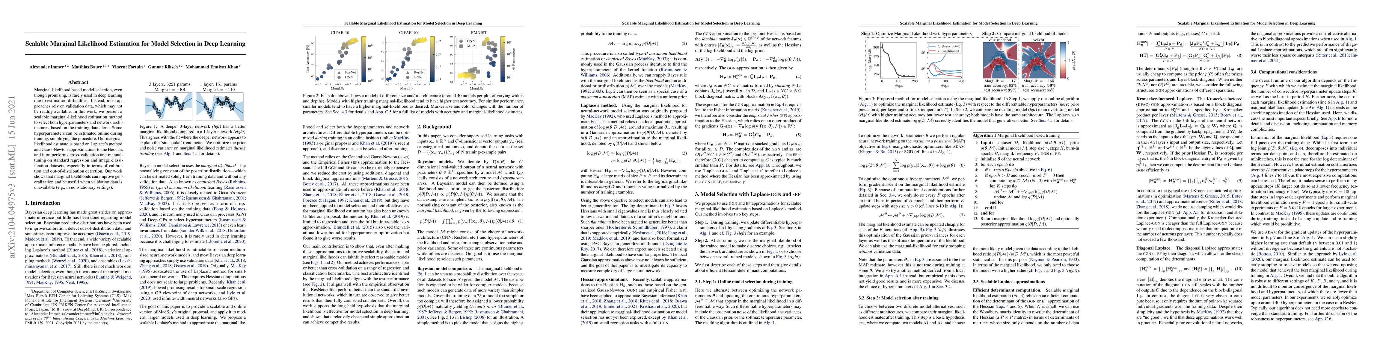 This paper introduces a scalable method for estimating marginal likelihoods to select hyperparameters and network architectures in deep learning, relying solely on training data. The proposed method, based on Laplace's method and Gauss-Newton approximations, outperforms traditional validation-based approaches in calibration and out-of-distribution detection, demonstrating its effectiveness even when validation data is not available.