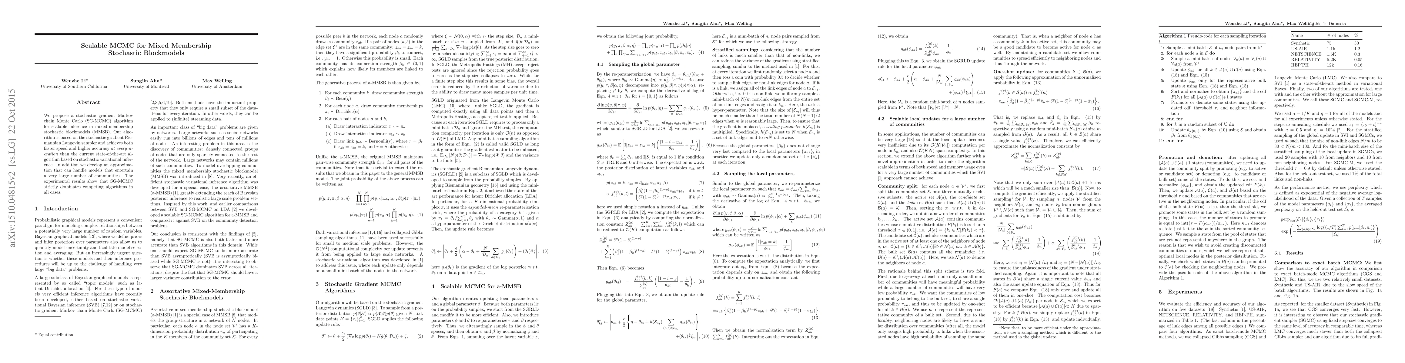 This paper introduces a scalable stochastic gradient Markov chain Monte Carlo (SG-MCMC) algorithm for mixed-membership stochastic blockmodels, achieving faster speed and higher accuracy compared to existing stochastic variational inference methods. The proposed algorithm also handles large community models effectively, outperforming competing algorithms in experiments.