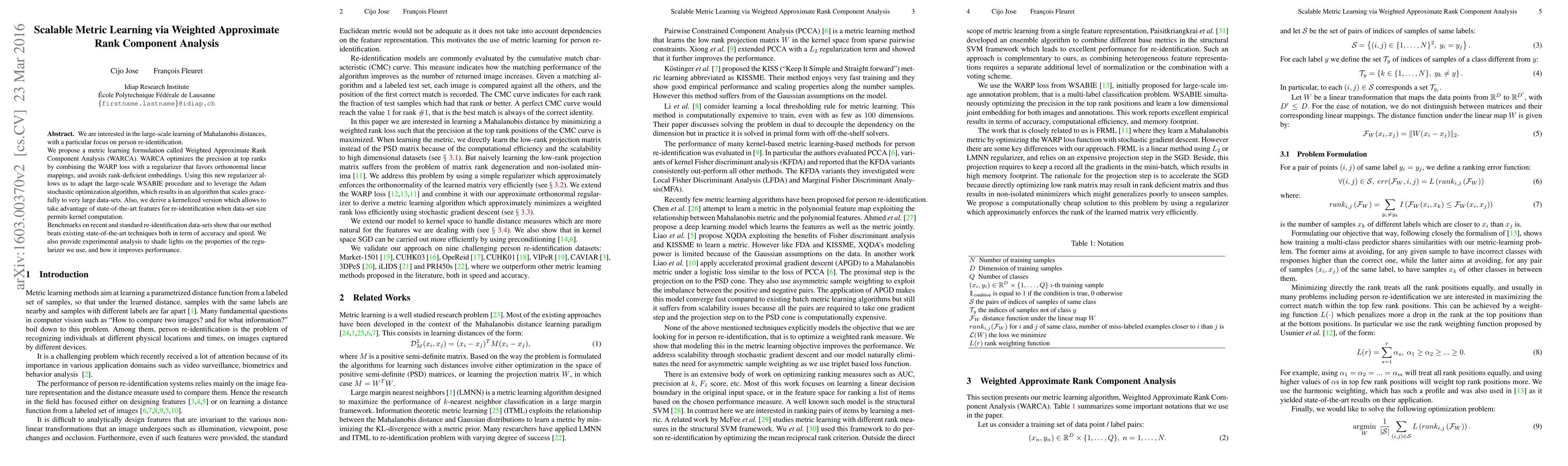 We are interested in the large-scale learning of Mahalanobis distances, with a particular focus on person re-identification. We propose a metric learning formulation called Weighted Approximate Rank Component Analysis (WARCA). WARCA optimizes the precision at top ranks by combining the WARP loss with a regularizer that favors orthonormal linear mappings, and avoids rank-deficient embeddings. Using this new regularizer allows us to adapt the large-scale WSABIE procedure and to leverage the Adam stochastic optimization algorithm, which results in an algorithm that scales gracefully to very large data-sets. Also, we derive a kernelized version which allows to take advantage of state-of-the-art features for re-identification when data-set size permits kernel computation. Benchmarks on recent and standard re-identification data-sets show that our method beats existing state-of-the-art techniques both in term of accuracy and speed. We also provide experimental analysis to shade lights on the properties of the regularizer we use, and how it improves performance.