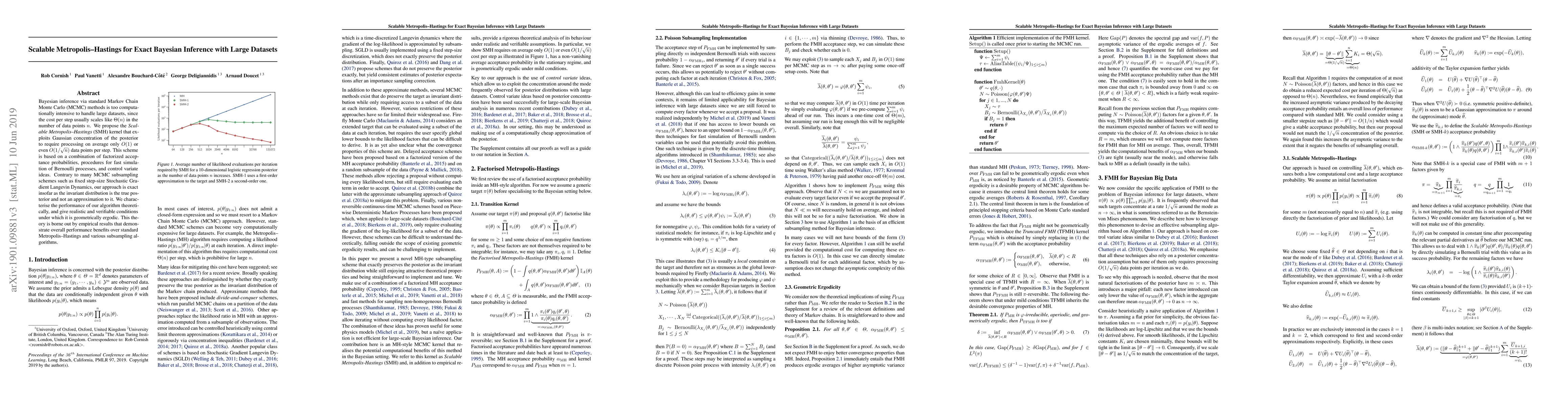 This paper proposes the Scalable Metropolis-Hastings (SMH) kernel for exact Bayesian inference on large datasets, which processes on average only $O(1)$ or $O(1/\sqrt{n})$ data points per step, contrasting with standard MCMC methods. The method is exact, geometrically ergodic under certain conditions, and outperforms standard algorithms in empirical tests.