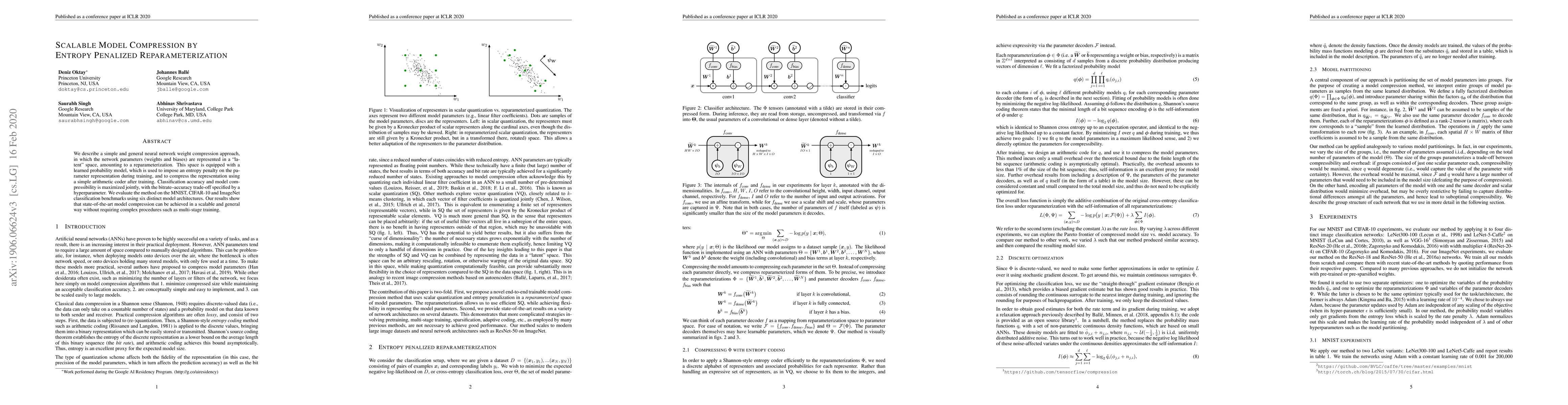 This paper introduces a simple method for compressing neural network weights using entropy penalized reparameterization, achieving state-of-the-art compression while maintaining classification accuracy.