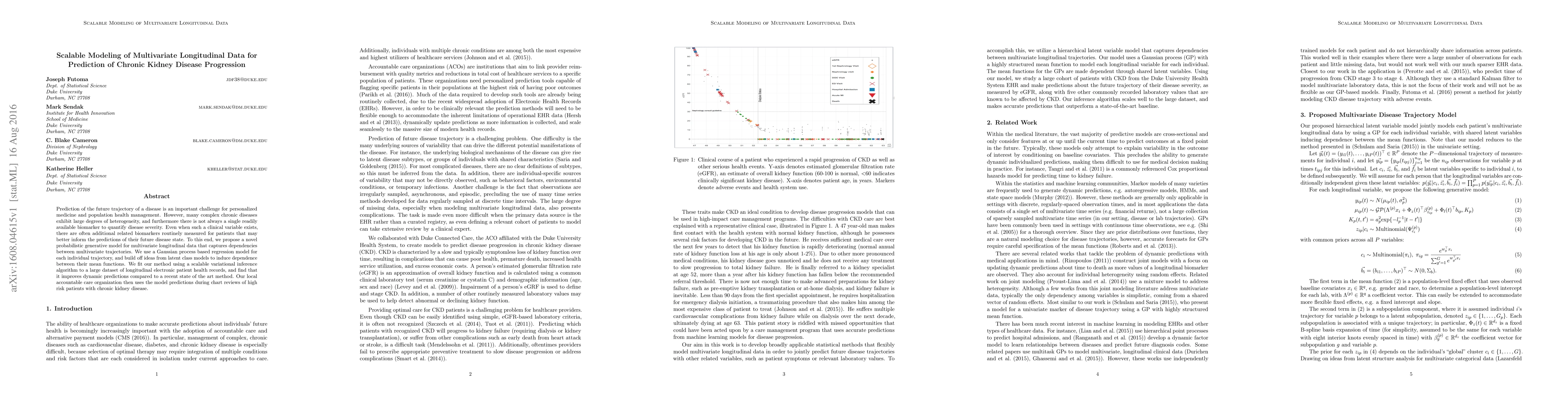 This paper proposes a scalable probabilistic generative model for predicting chronic kidney disease progression using multivariate longitudinal data. The model leverages Gaussian process regression and latent class ideas to capture dependencies between multiple trajectories, improving predictions over existing methods.