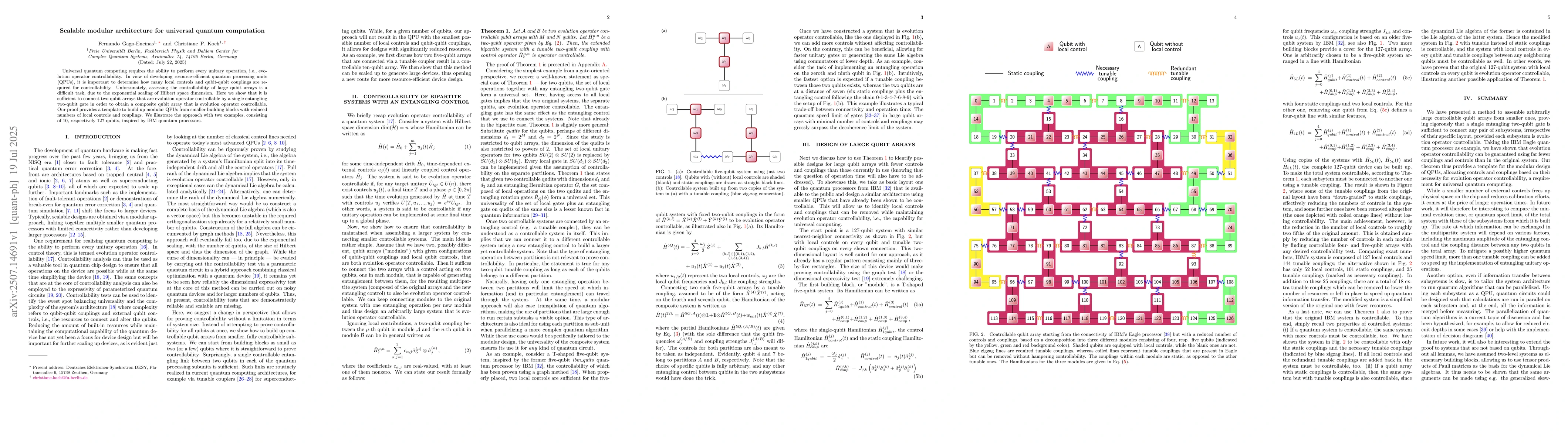 Universal quantum computing requires the ability to perform every unitary operation, i.e., evolution operator controllability. In view of developing resource-efficient quantum processing units (QPUs), it is important to determine how many local controls and qubit-qubit couplings are required for controllability. Unfortunately, assessing the controllability of large qubit arrays is a difficult task, due to the exponential scaling of Hilbert space dimension. Here we show that it is sufficient to connect two qubit arrays that are evolution operator controllable by a single entangling two-qubit gate in order to obtain a composite qubit array that is evolution operator controllable. Our proof provides a template to build up modular QPUs from smaller building blocks with reduced numbers of local controls and couplings. We illustrate the approach with two examples, consisting of 10, respectively 127 qubits, inspired by IBM quantum processors.