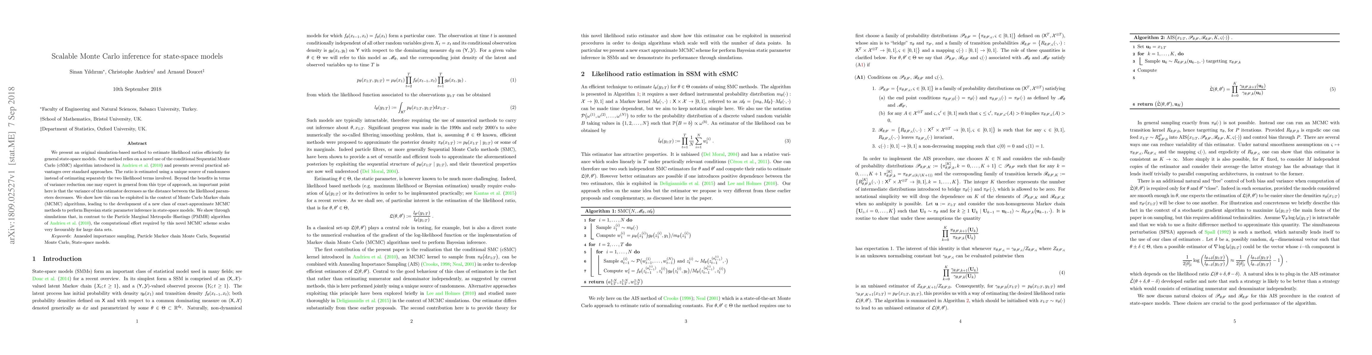 This paper introduces a scalable Monte Carlo method for estimating likelihood ratios in state-space models, leveraging a novel use of conditional Sequential Monte Carlo to reduce variance. The proposed method scales efficiently with large datasets, offering practical advantages over existing Particle Marginal Metropolis-Hastings approaches.