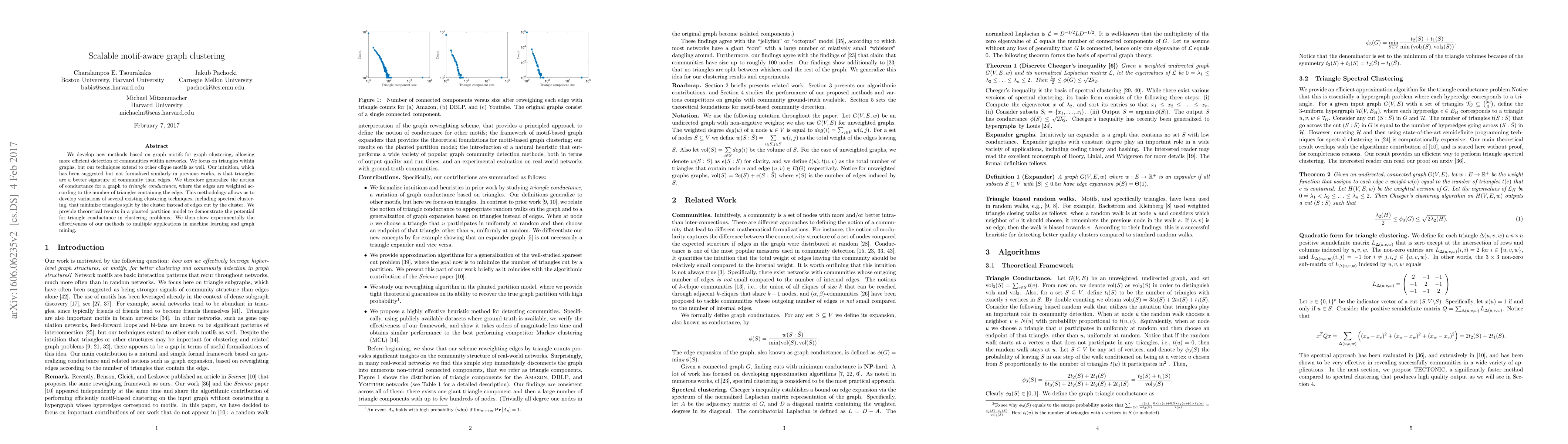 This paper introduces scalable graph clustering methods based on graph motifs, particularly triangles, to detect communities more efficiently. It proposes a novel triangle conductance metric and extends existing clustering techniques to minimize triangle splits, demonstrating effectiveness in machine learning and graph mining applications.
