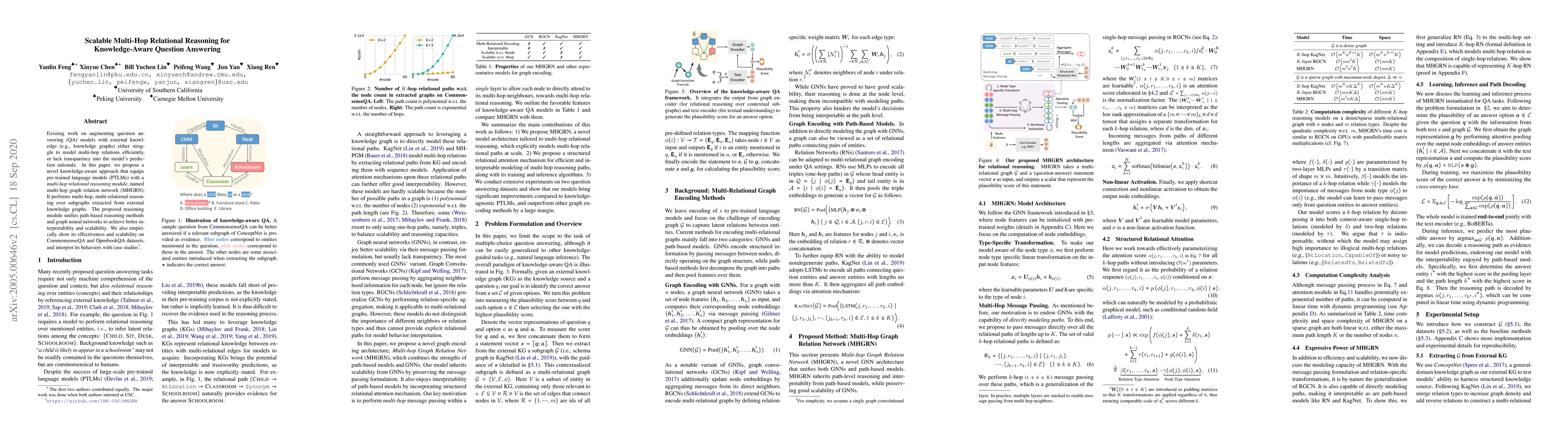 This paper introduces a novel multi-hop graph relation network (MHGRN) to enhance question answering models with scalable multi-relational reasoning from knowledge graphs, combining path-based and graph neural network techniques for improved interpretability and performance on datasets like CommonsenseQA and OpenbookQA.