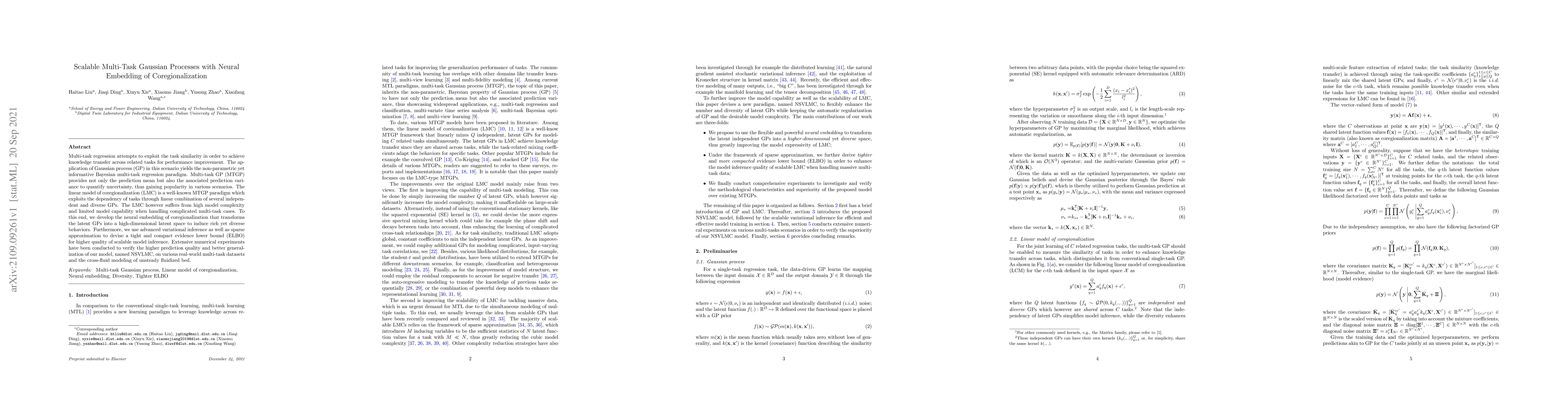 This paper proposes a scalable multi-task Gaussian process (MTGP) model with neural embedding of coregionalization to improve performance and generalization in multi-task regression. The method uses advanced variational inference and sparse approximation to achieve efficient and high-quality inference, demonstrating superior prediction quality on various datasets.