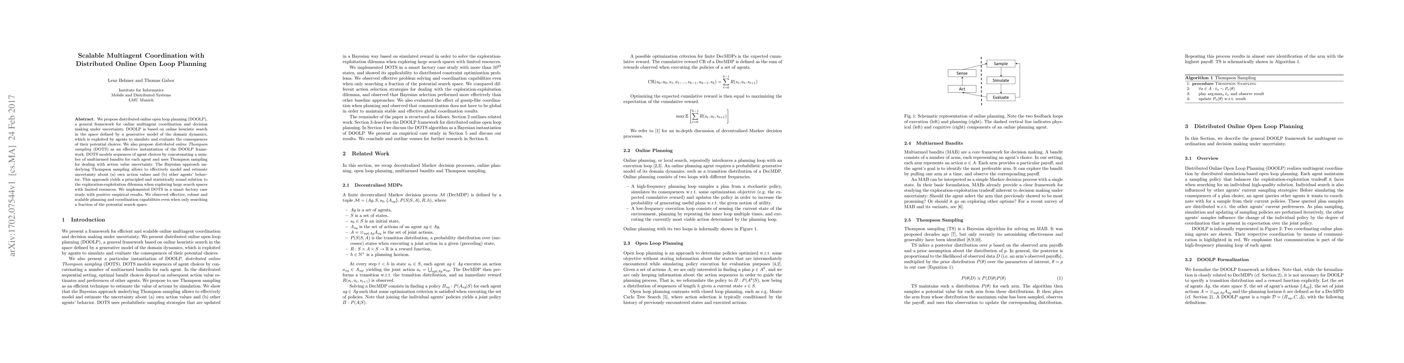 This paper proposes distributed online open loop planning (DOOLP) for multiagent coordination, utilizing online heuristic search and a generative model of domain dynamics. It introduces distributed online Thompson sampling (DOTS) as an effective implementation, leveraging Bayesian Thompson sampling to manage uncertainty and optimize exploration-exploitation trade-offs, demonstrating scalability and effectiveness in a smart factory case study.