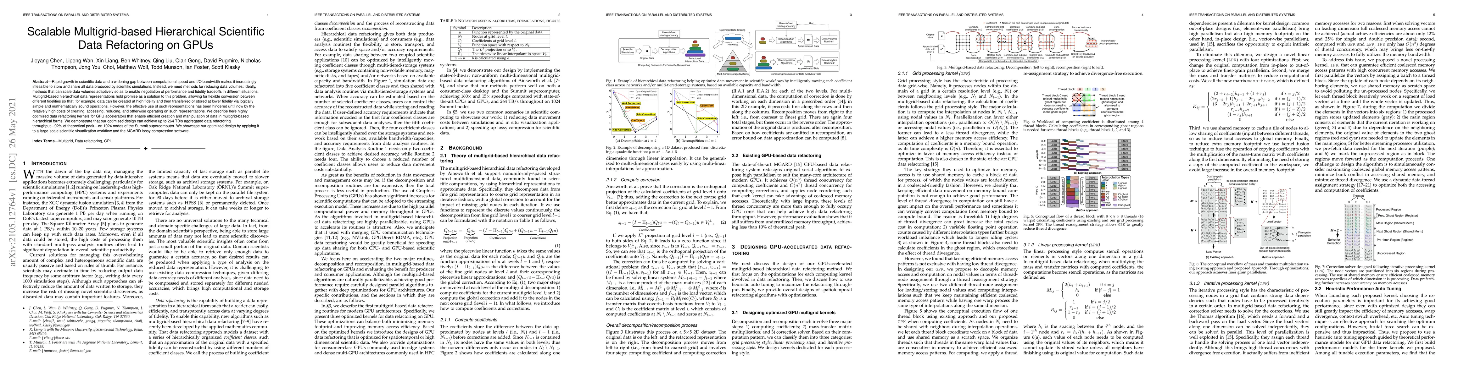 This paper presents highly optimized GPU-based kernels for efficient multigrid-based hierarchical scientific data refactoring, achieving up to 264 TB/s throughput on 1024 nodes, enabling scalable data volume reduction and performance-fidelity tradeoffs. The approach is demonstrated through applications in scientific visualization and lossy compression.