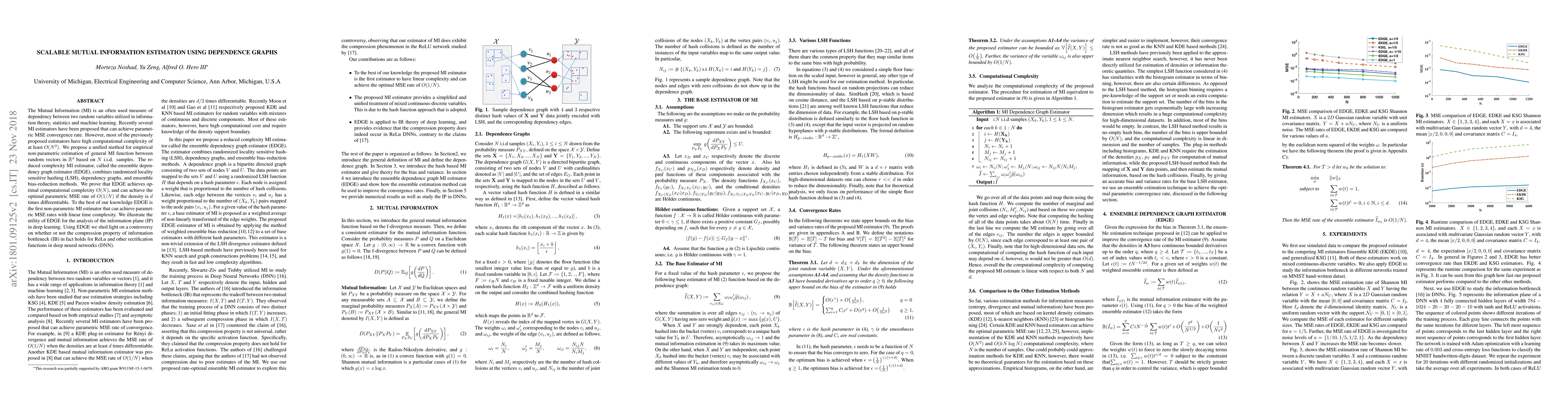The Mutual Information (MI) is an often used measure of dependency between two random variables utilized in information theory, statistics and machine learning. Recently several MI estimators have been proposed that can achieve parametric MSE convergence rate. However, most of the previously proposed estimators have the high computational complexity of at least $O(N^2)$. We propose a unified method for empirical non-parametric estimation of general MI function between random vectors in $\mathbb{R}^d$ based on $N$ i.i.d. samples. The reduced complexity MI estimator, called the ensemble dependency graph estimator (EDGE), combines randomized locality sensitive hashing (LSH), dependency graphs, and ensemble bias-reduction methods. We prove that EDGE achieves optimal computational complexity $O(N)$, and can achieve the optimal parametric MSE rate of $O(1/N)$ if the density is $d$ times differentiable. To the best of our knowledge EDGE is the first non-parametric MI estimator that can achieve parametric MSE rates with linear time complexity. We illustrate the utility of EDGE for the analysis of the information plane (IP) in deep learning. Using EDGE we shed light on a controversy on whether or not the compression property of information bottleneck (IB) in fact holds for ReLu and other rectification functions in deep neural networks (DNN).