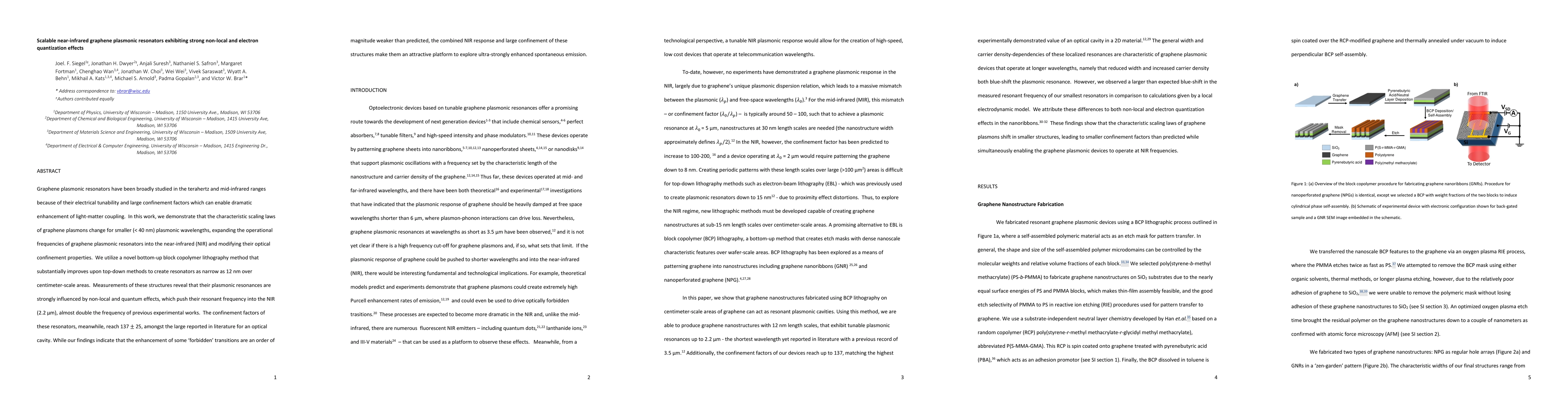 This paper demonstrates scalable near-infrared graphene plasmonic resonators with strong non-local and electron quantization effects, achieved via a novel bottom-up lithography method. The resonators exhibit enhanced optical confinement and push resonant frequencies into the NIR, nearly doubling previous experimental limits.