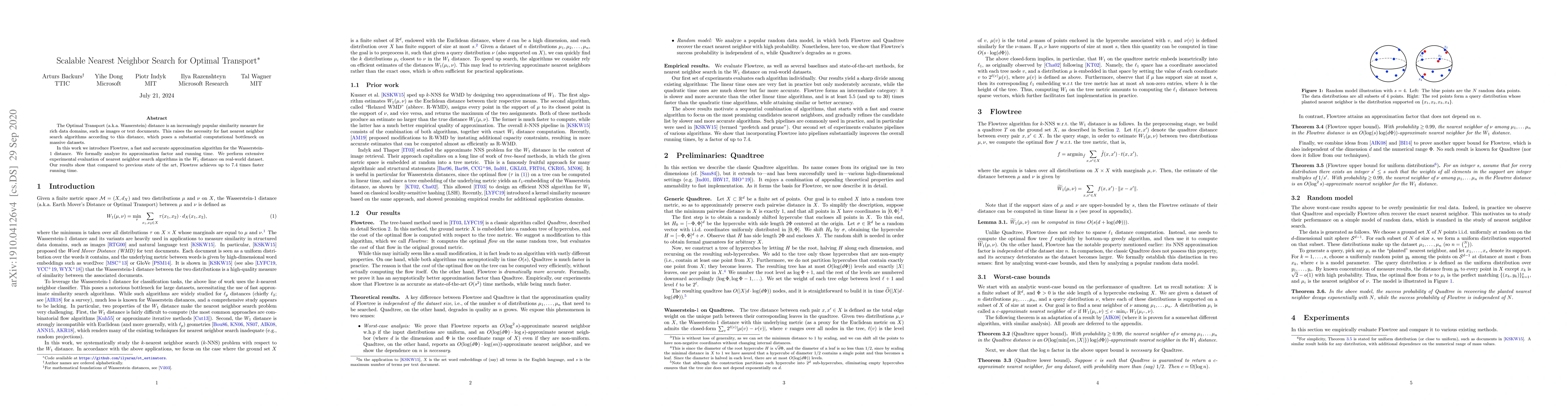 This paper presents Flowtree, a scalable algorithm for fast nearest neighbor search based on the Wasserstein-1 distance, achieving up to 7.4 times faster computation compared to previous methods, while maintaining accuracy through a formal analysis of its approximation factor and running time.