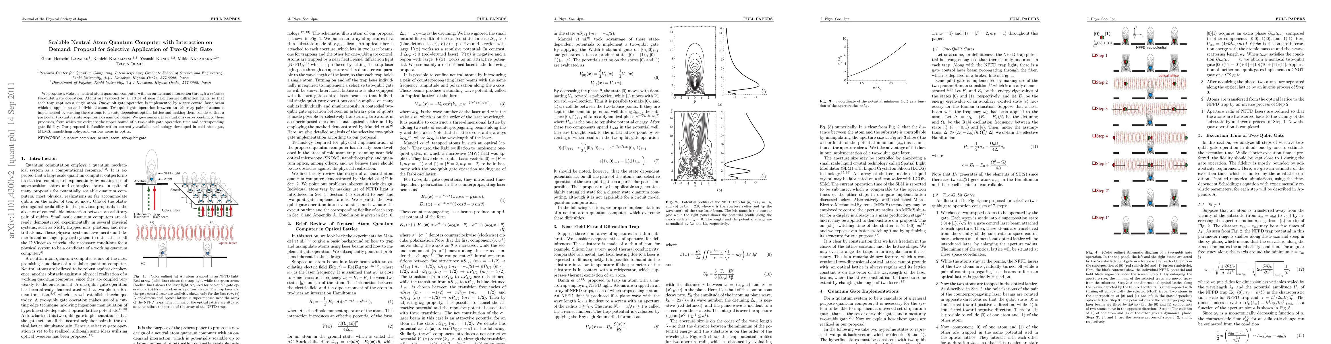 This paper proposes a scalable neutral atom quantum computer with on-demand interaction via selective two-qubit gates. It utilizes a lattice of Fresnel diffraction lights to trap single atoms, implementing one-qubit gates with laser beams and two-qubit gates through controlled collisions in a state-dependent optical lattice.