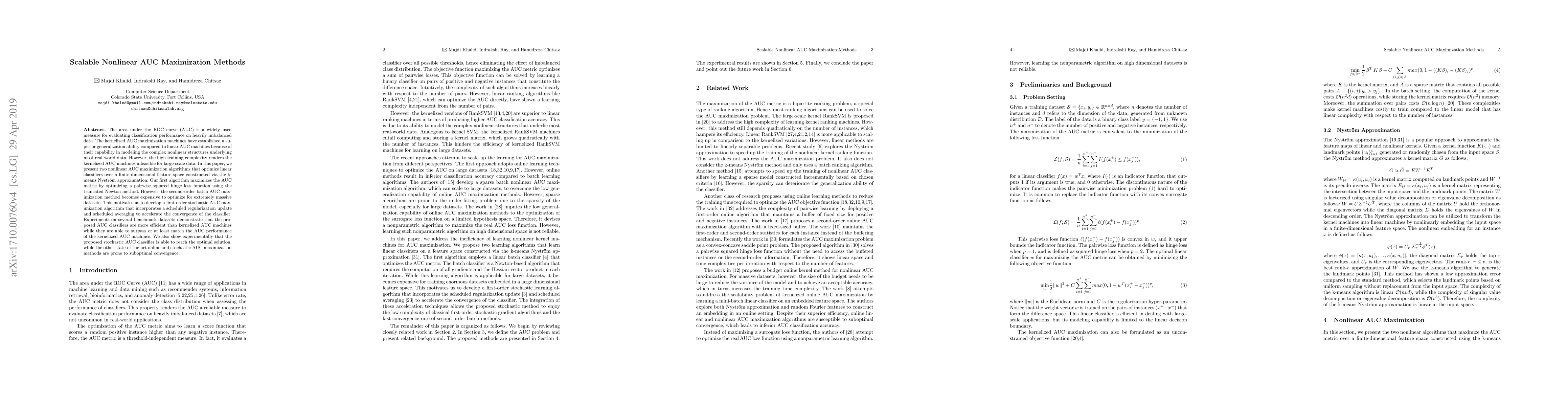 The area under the ROC curve (AUC) is a measure of interest in various machine learning and data mining applications. It has been widely used to evaluate classification performance on heavily imbalanced data. The kernelized AUC maximization machines have established a superior generalization ability compared to linear AUC machines because of their capability in modeling the complex nonlinear structure underlying most real-world data. However, the high training complexity renders the kernelized AUC machines infeasible for large-scale data. In this paper, we present two nonlinear AUC maximization algorithms that optimize pairwise linear classifiers over a finite-dimensional feature space constructed via the k-means Nystr\"{o}m method. Our first algorithm maximize the AUC metric by optimizing a pairwise squared hinge loss function using the truncated Newton method. However, the second-order batch AUC maximization method becomes expensive to optimize for extremely massive datasets. This motivate us to develop a first-order stochastic AUC maximization algorithm that incorporates a scheduled regularization update and scheduled averaging techniques to accelerate the convergence of the classifier. Experiments on several benchmark datasets demonstrate that the proposed AUC classifiers are more efficient than kernelized AUC machines while they are able to surpass or at least match the AUC performance of the kernelized AUC machines. The experiments also show that the proposed stochastic AUC classifier outperforms the state-of-the-art online AUC maximization methods in terms of AUC classification accuracy.