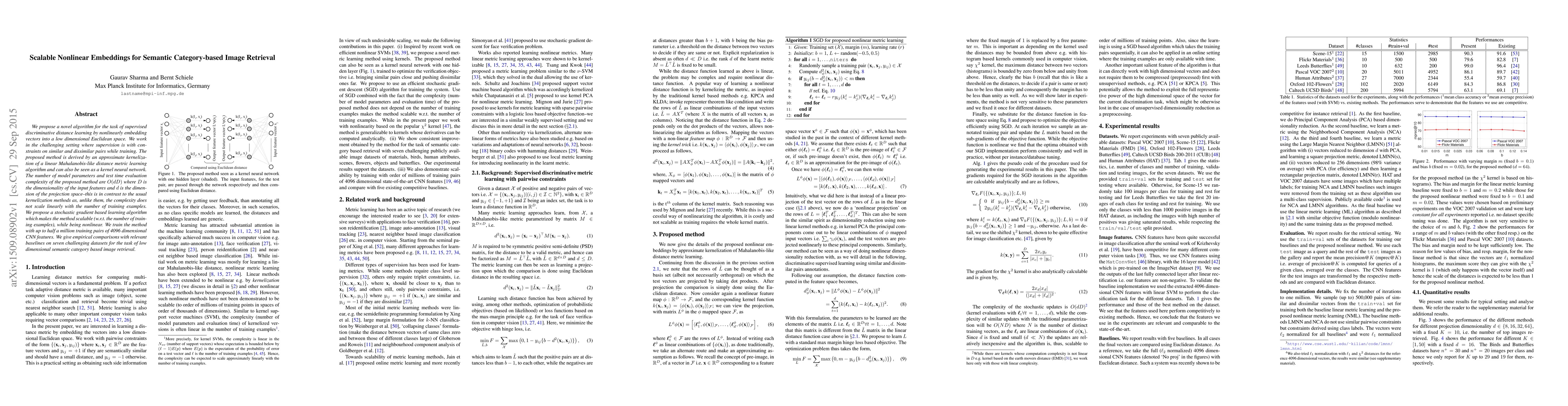 We propose a novel algorithm for the task of supervised discriminative distance learning by nonlinearly embedding vectors into a low dimensional Euclidean space. We work in the challenging setting where supervision is with constraints on similar and dissimilar pairs while training. The proposed method is derived by an approximate kernelization of a linear Mahalanobis-like distance metric learning algorithm and can also be seen as a kernel neural network. The number of model parameters and test time evaluation complexity of the proposed method are O(dD) where D is the dimensionality of the input features and d is the dimension of the projection space - this is in contrast to the usual kernelization methods as, unlike them, the complexity does not scale linearly with the number of training examples. We propose a stochastic gradient based learning algorithm which makes the method scalable (w.r.t. the number of training examples), while being nonlinear. We train the method with up to half a million training pairs of 4096 dimensional CNN features. We give empirical comparisons with relevant baselines on seven challenging datasets for the task of low dimensional semantic category based image retrieval.